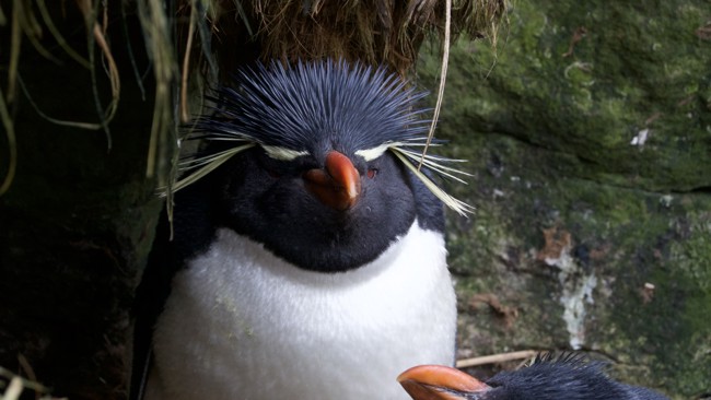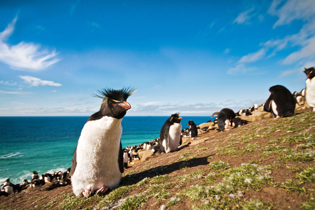 A small and spunky species that lives on the Falkland Islands. They climb very steep cliffs to get to their nests by hopping with both feet.