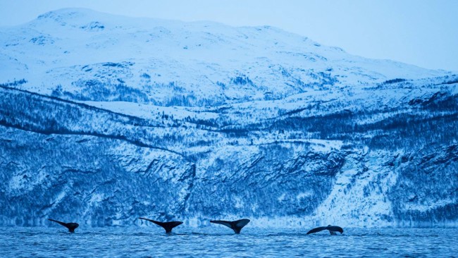 Watching the magnificent northern lights the other night we experienced how cameras are more sensitive to light and therefore “see” more of the weak northern lights than the eye. Here and now it is the other way round. No images will ever be able to capture the feeling in seeing four magnificent tail fins gracefully bend over the water surface before disappearing into the deep. My eyes fill with tears, and it is not only because of the wind