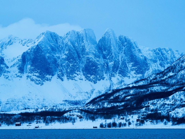 Mid-January this far north of the Arctic Circle is a very special time of the year. The sun hardly appears above the horizon, but that doesn’t mean there is no daylight. Instead, the sky and the landscape glow in ever changing shades of blue. Steep mountains in white, gray, blue and black rise from the sea. It’s as if our journey takes place in a painting come alive.