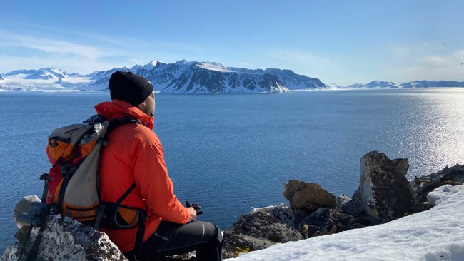 I stepped out of the Zodiac into the ocean on the beach, again thanking my colleagues who had told me that knee high boots are a must in Svalbard. We did a short hike in the white snow and the closer we got to the bird mountain, the louder it got. The birds flew their way as we approached. We climbed up the mountain carefully not to destroy the moss. Some climbed a little higher while others remained at the foot of the mountain. Always in the company of our guides. We sat down and after a while the birds came back, some really close. We sat there for a long time with an incredible view of the endless sea and felt that we really are small on earth. The thousands of birds that joined us here are the smallest in Svalbard and are called Little Auk.