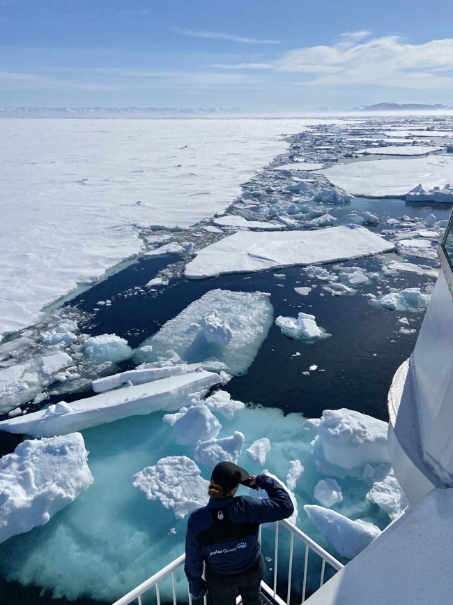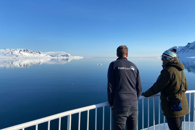 I was alone up on the deck as our ship M/S Quest slowly left Longyearbyen in Svalbard. I had just finished a video call with my family and now I watched the service on my phone decrease quickly, until the text "no service" appeared. I put the phone in my pocket and looked up at the most incredible view. Longyearbyen had just disappeared behind us, the rays from the sun were finding their way through the clouds to illuminate a few snow-capped mountains on the horizon and suddenly there it was, the silence!