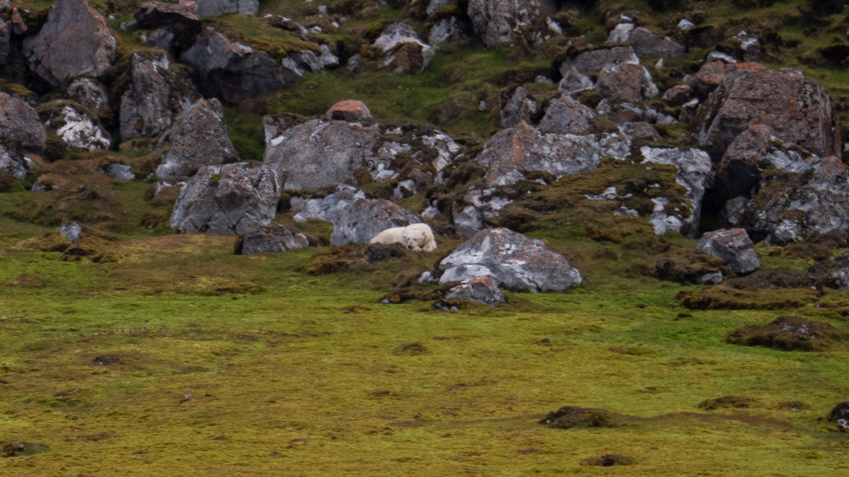 After leaving the pier we headed straight North to the other side of the bay for scouting. In less than 10 minutes, we spotted a small yellow dot behind a rock. As we approached, it became clear that it was indeed a polar bear, fast asleep. We stayed there for nearly 2 hours, but this was a lethargic female, and she didn't budge. Nonetheless, it marked our first bear sighting of the voyage!