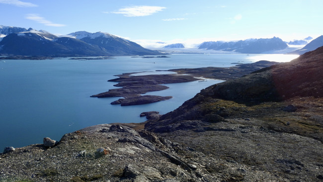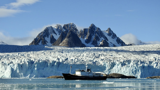 It was a misty and rainy August morning, M/S Sjøveien sailed peacefully into the Liefdefjorden, surrounded by red mountains and snow-capped peaks. During breakfast the sky slowly but surely cleared up and was filled with sunshine and soft clouds, the water was still and the magnificent Monacobreen glacier became visible, it was sparkling in the light.