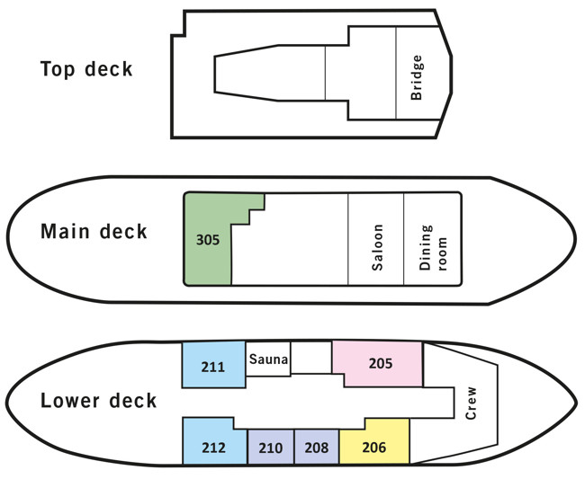 M/S Balto offers relaxed luxury accommodation for 12 guests in 7 spacious cabins, all with private facilities and lower beds. The richly appointed saloon and beautiful dining messroom feature crotch-mahogany panelling, a bar, a library, and coffee and tea stations. There are several open and semi-enclosed deck spaces where you can enjoy the stunning Arctic scenery. On the guest deck, there is a small sauna. With the two Zodiacs, we will explore the wilderness and go ashore in settlements and breathtaking natural landscapes.