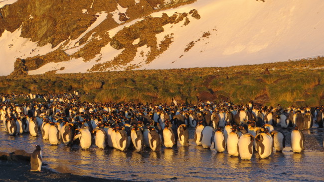 We are told to keep a distance of five meters, but it is difficult! Nor do these rules of conduct seem to have been translated into Penguini, for there are always some tough ones among these woolly tufts who whistle, wave their wing pads and come very close to you. At one point, one of the crew lay down on the ground and within five minutes he had five brown woolen tufts on his back - he later said that it had tickled him enormously and that he had to fight not to move. Back on the ship, we received strict orders from the expedition leader that he did not want to see a single passenger lying flat on the ground during the next landing! We made the last disembarkation in South Georgia in Gold Bay - the first Zodiac left at 04:10, and I managed to catch the second. On a very narrow strip of beach we met lots of penguins, mainly king penguins.
