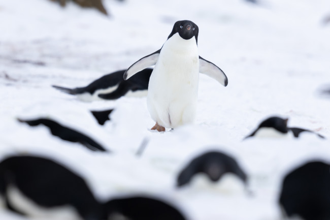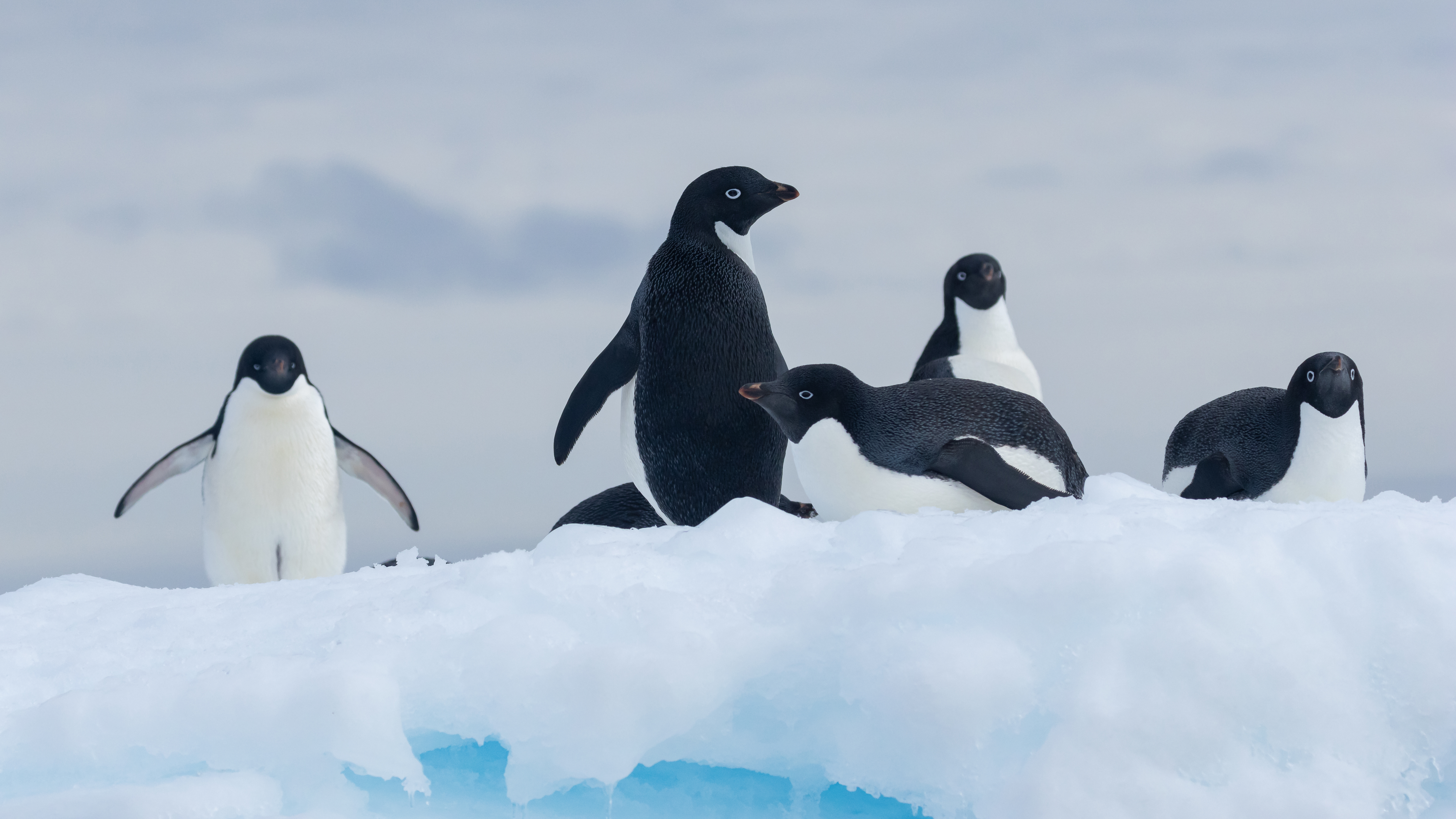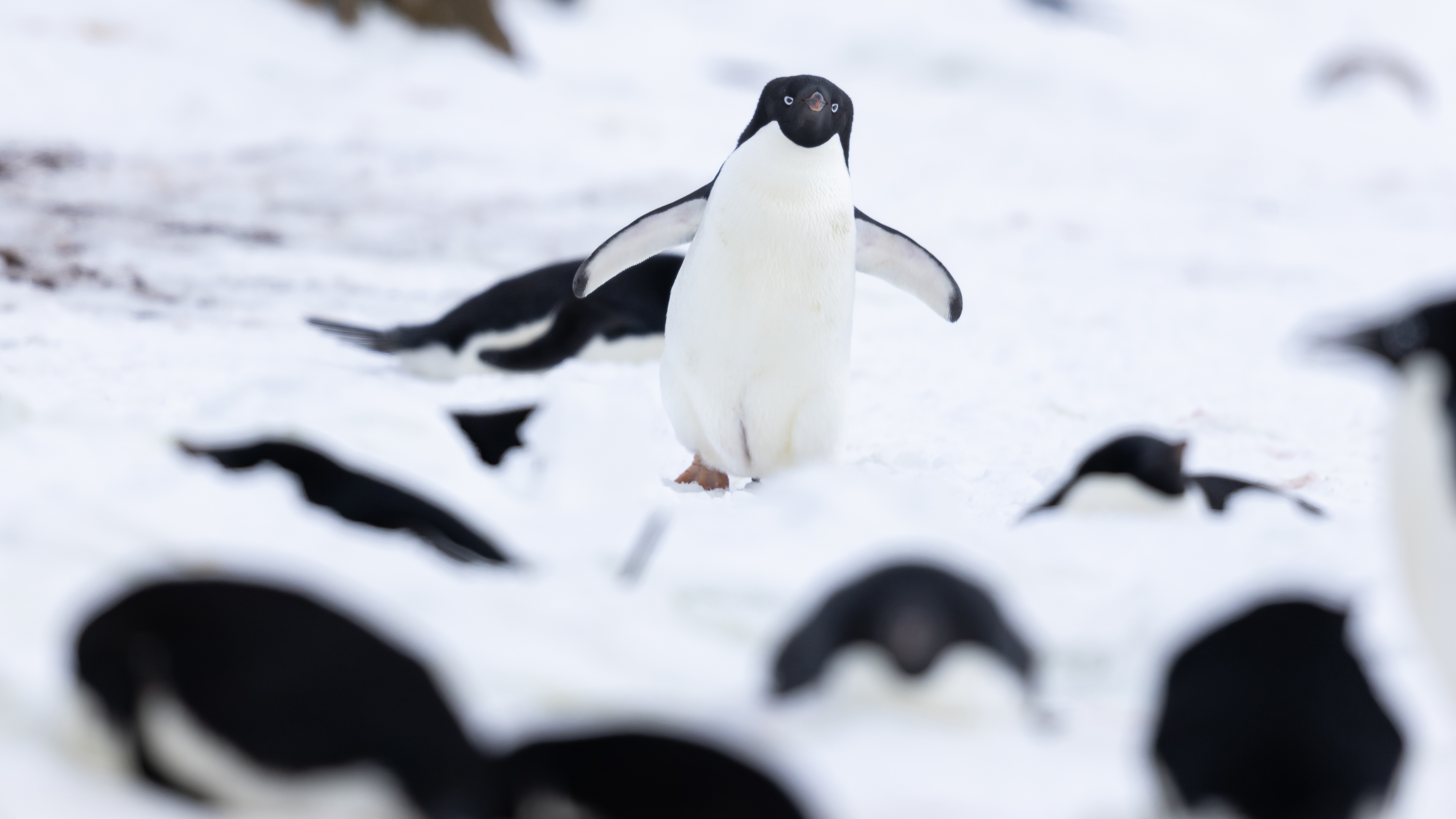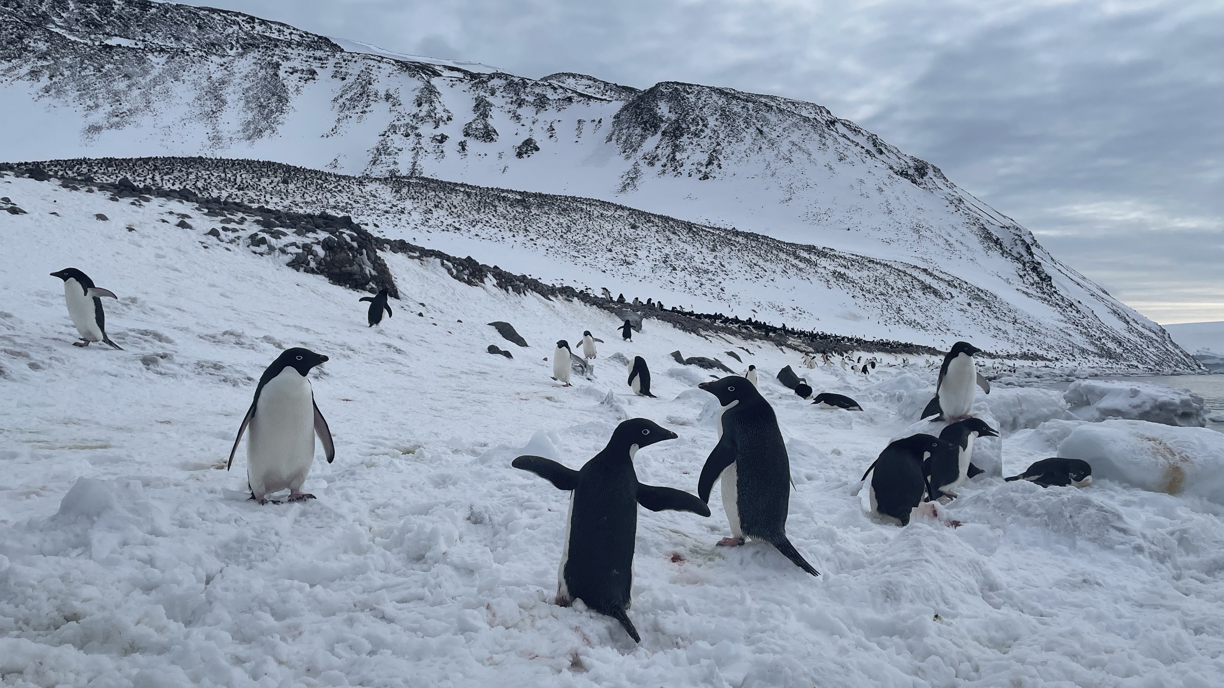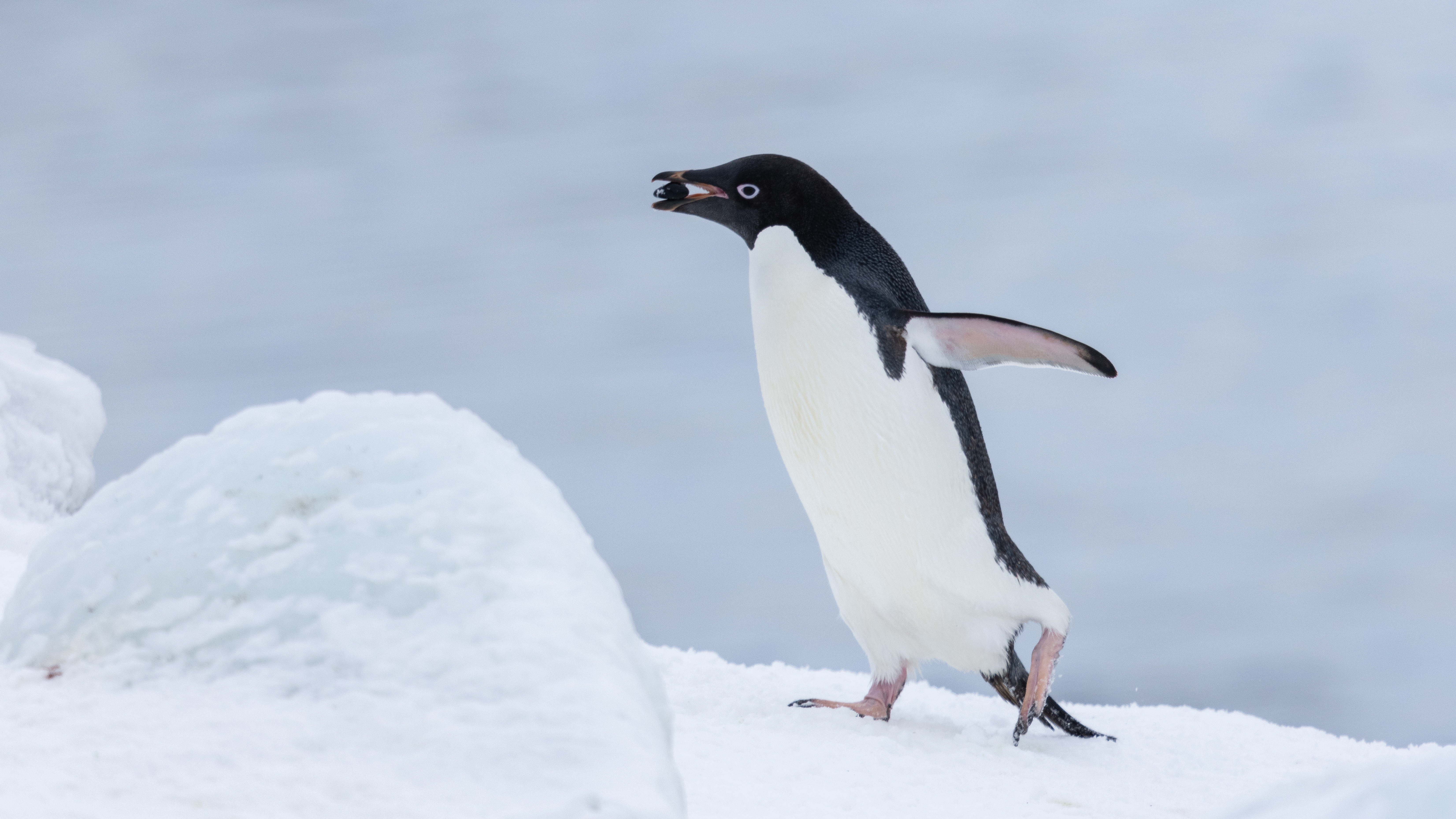 If you hear a mix of squawks, growls, and trumpet-like noises, it might be the Adélie penguins communicating with one another.