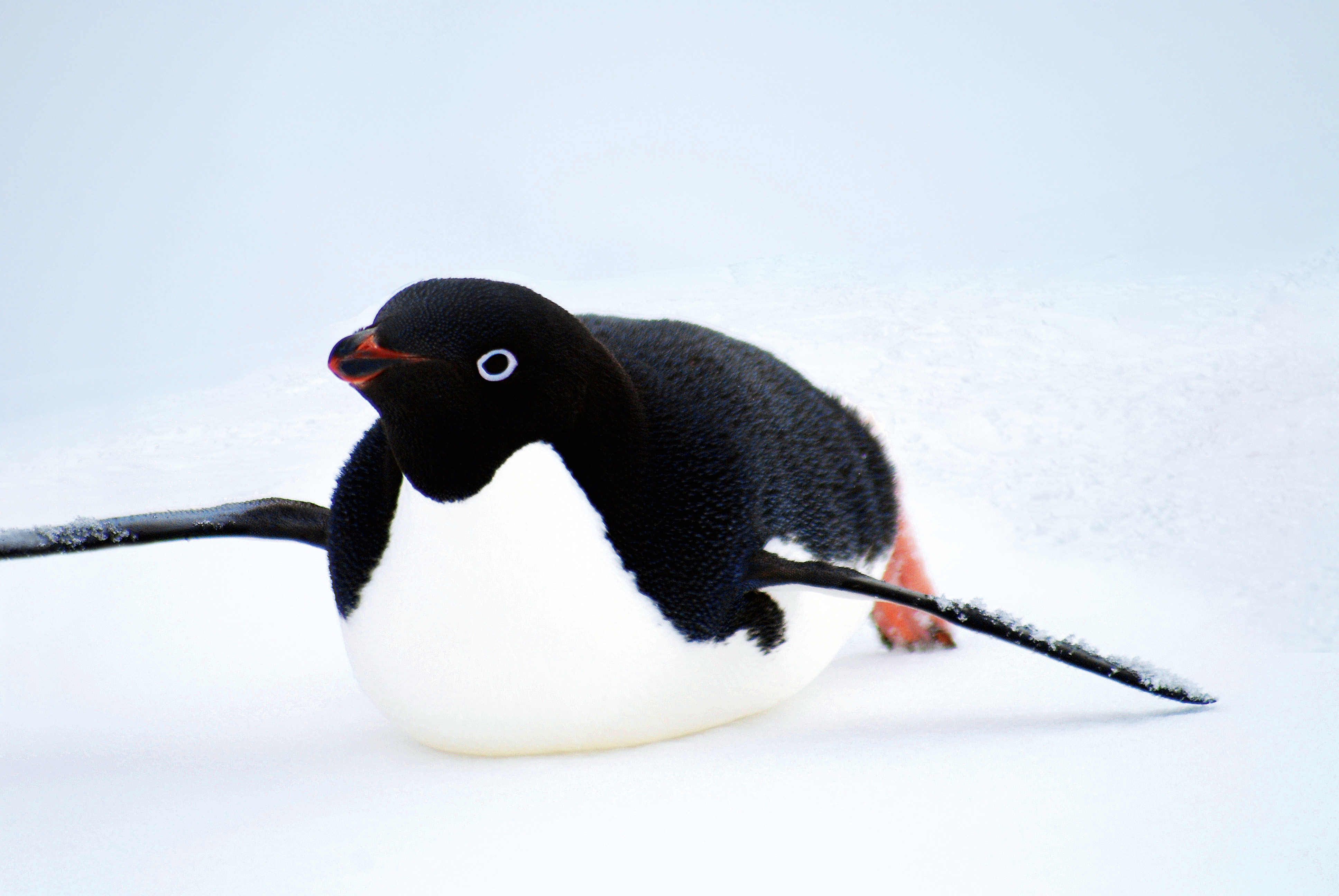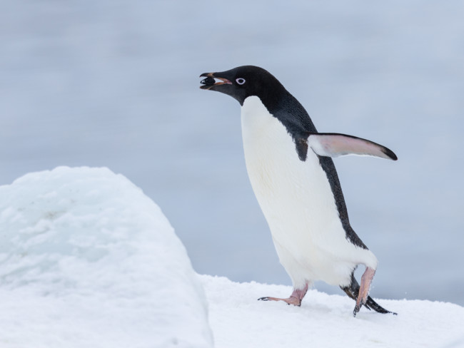 Although they move with the famous waddling penguin walk, Adélie penguins are skilled walkers and can cover long distances—sometimes several kilometres—to reach the sea. To conserve energy, they often slide on their bellies across the snow, using their propelling feet to push themselves forward.