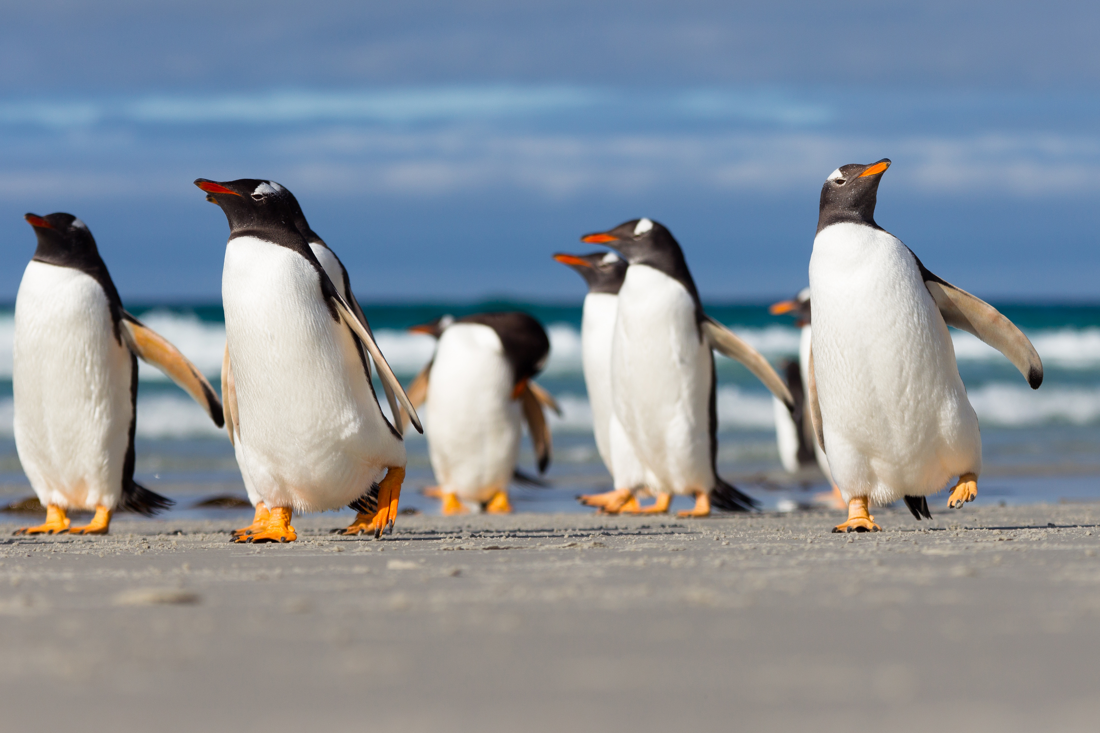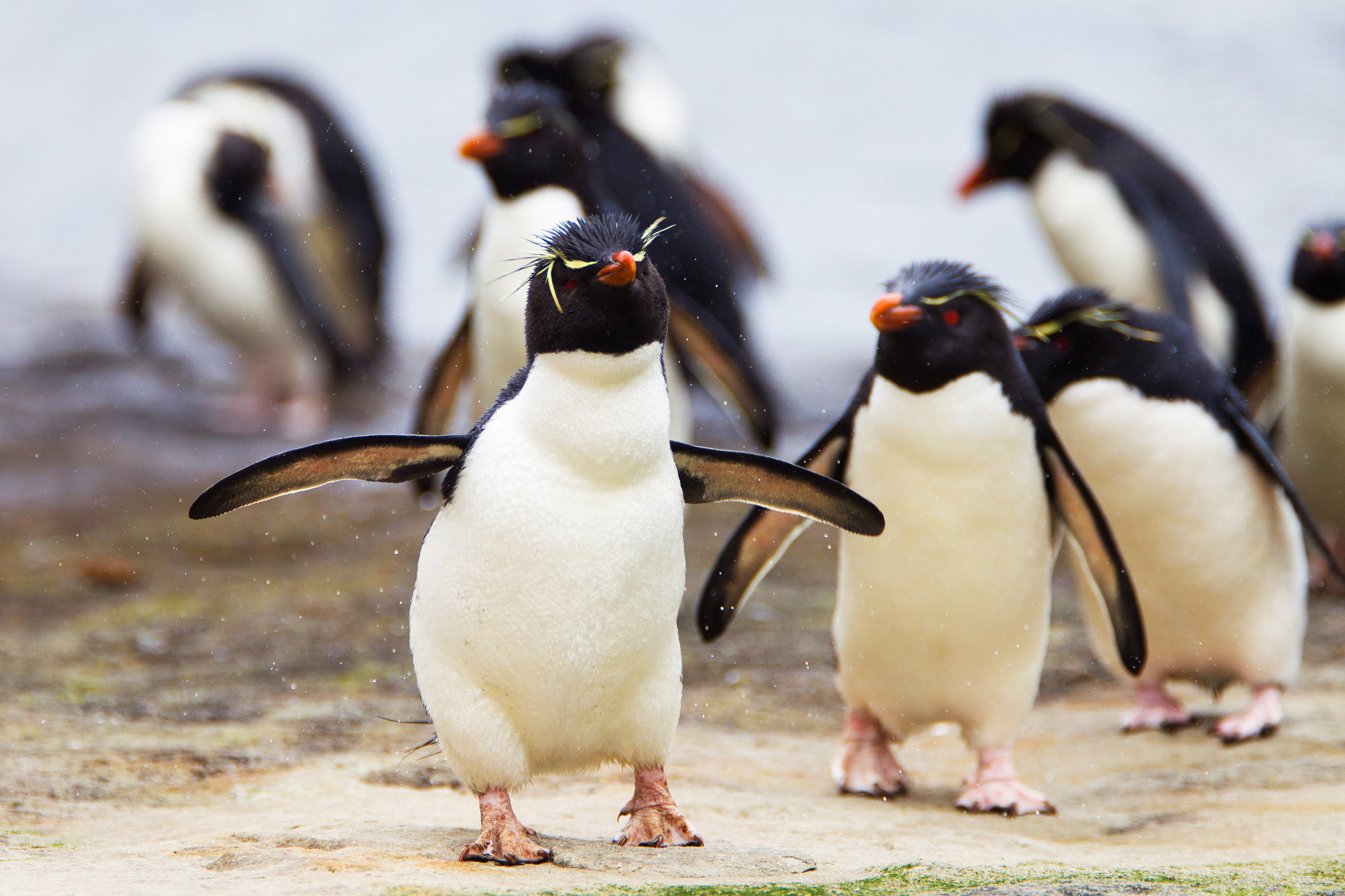 At the ascent sites, we were welcomed by a penguin committee - Magellan penguins nestled in caves like rabbits, gentoo penguins were strolling on the beaches and rockhopper penguins jumped in front of one's legs as we walked among the meter-high tussock grass.