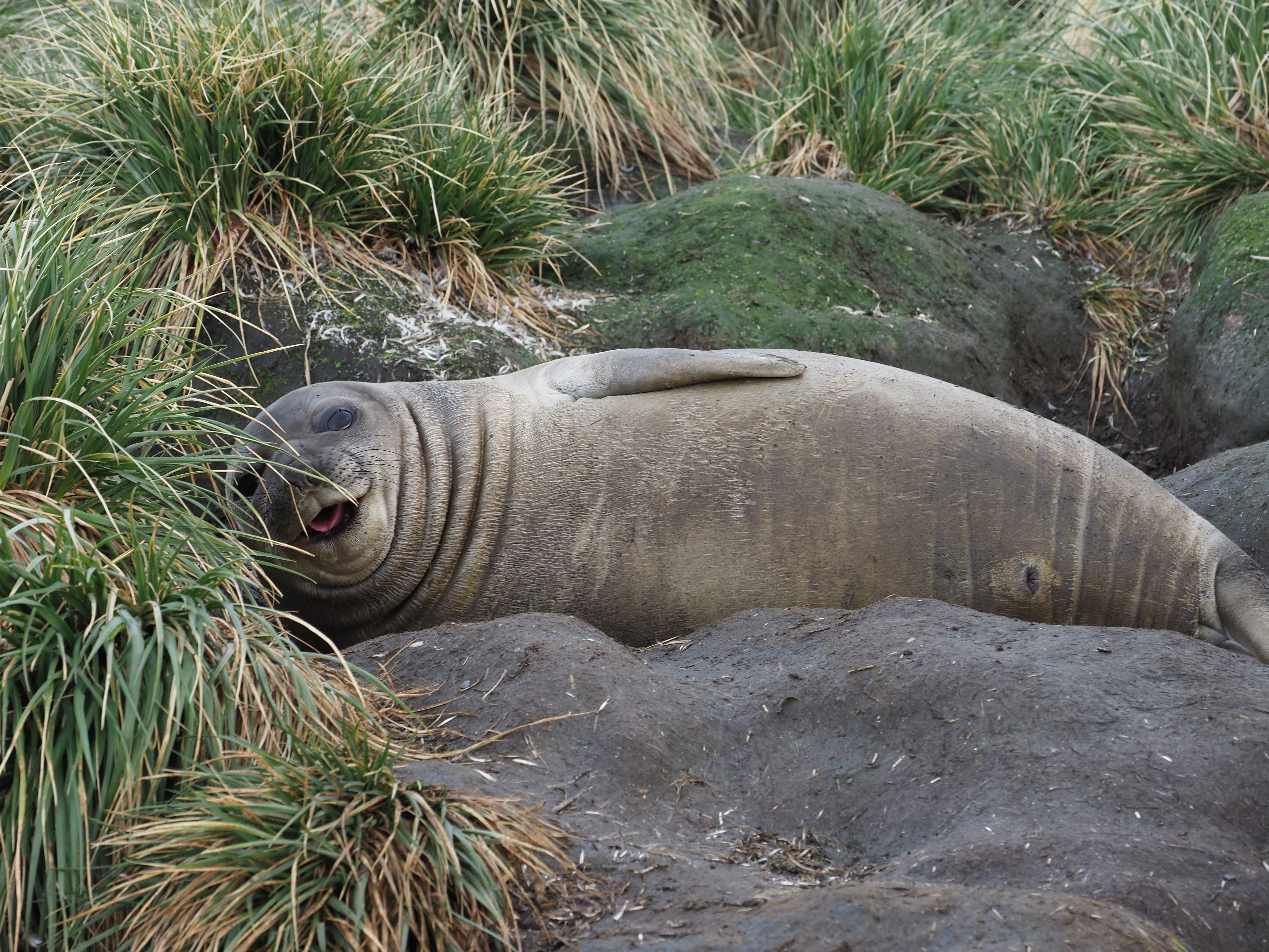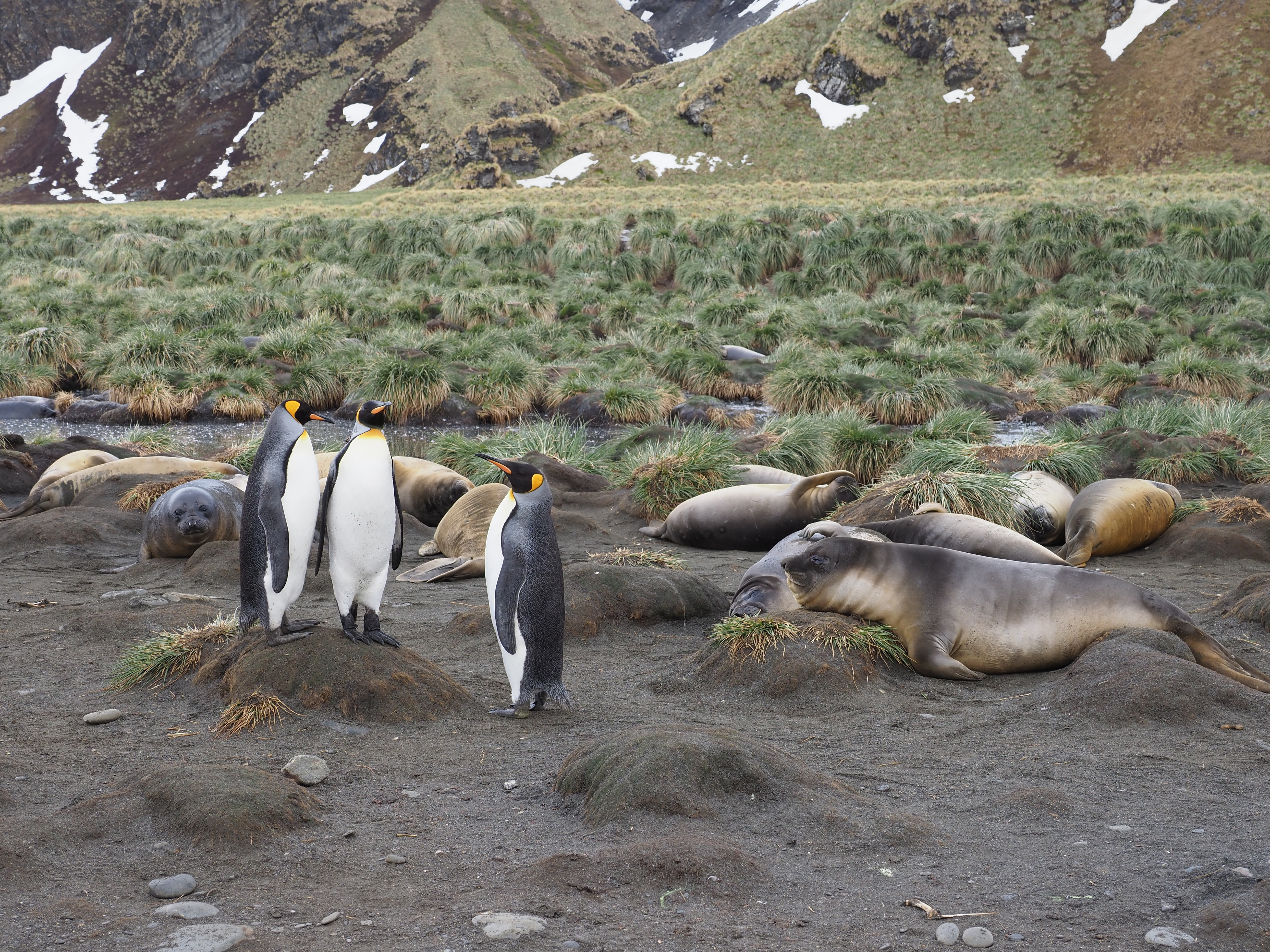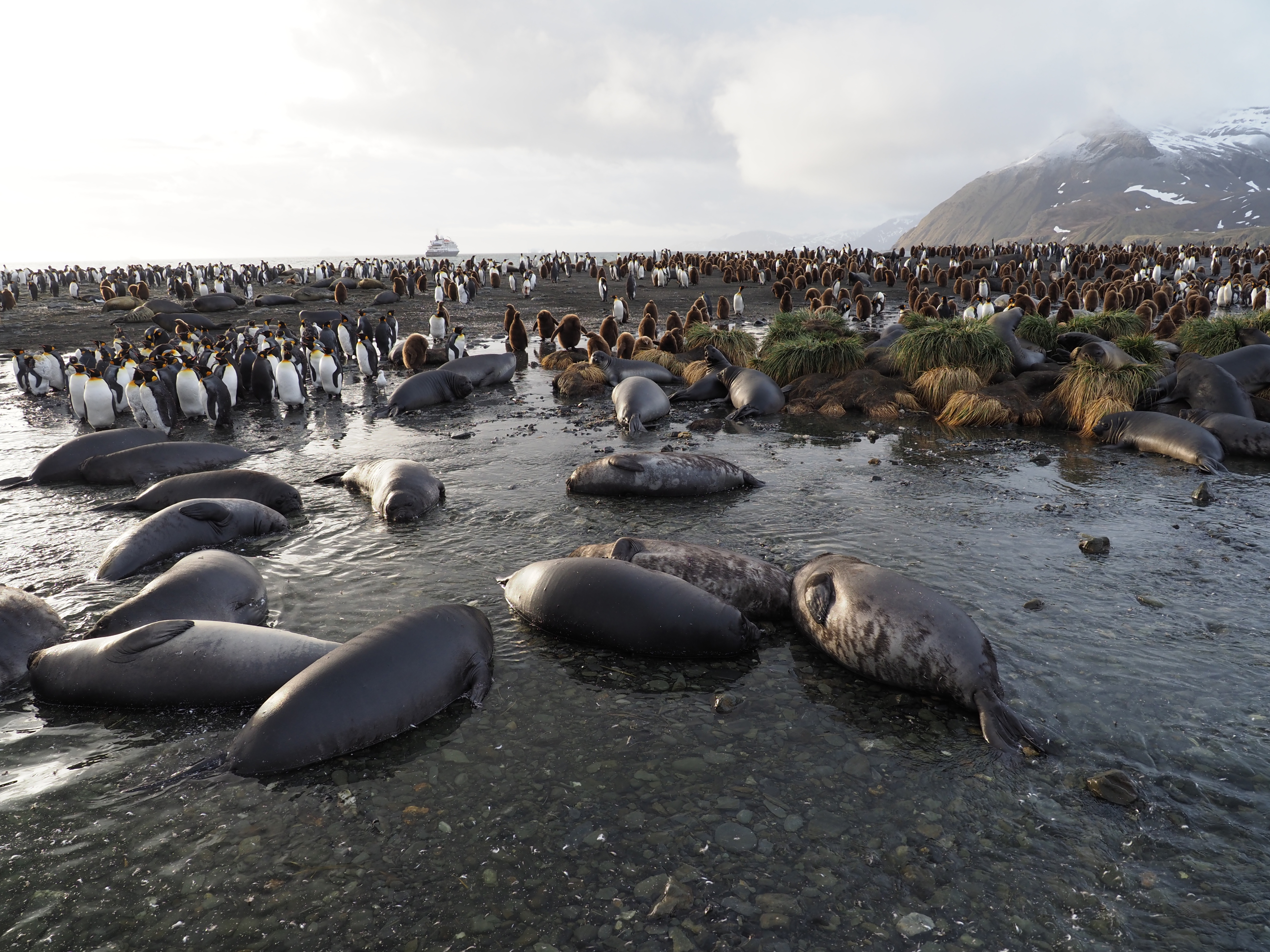 The sound of the waves drowns in the humming of the elephant seals, the delightful whine of the king penguins and the groaning of the fur seals - it is a way for them to show where the boundary of their territory goes. Once the ears get used to all the sounds, the eyes start to work too. Wherever I look, there are hundreds of king penguins standing in large clusters or strolling around. The elephant seals are like little lumps everywhere and are looking for eye contact with their big, round eyes. Suddenly we hear a thundering noise and the ground vibrates slightly. Right next to us are two elephant seals who are about to challenge each other in a harem fight!