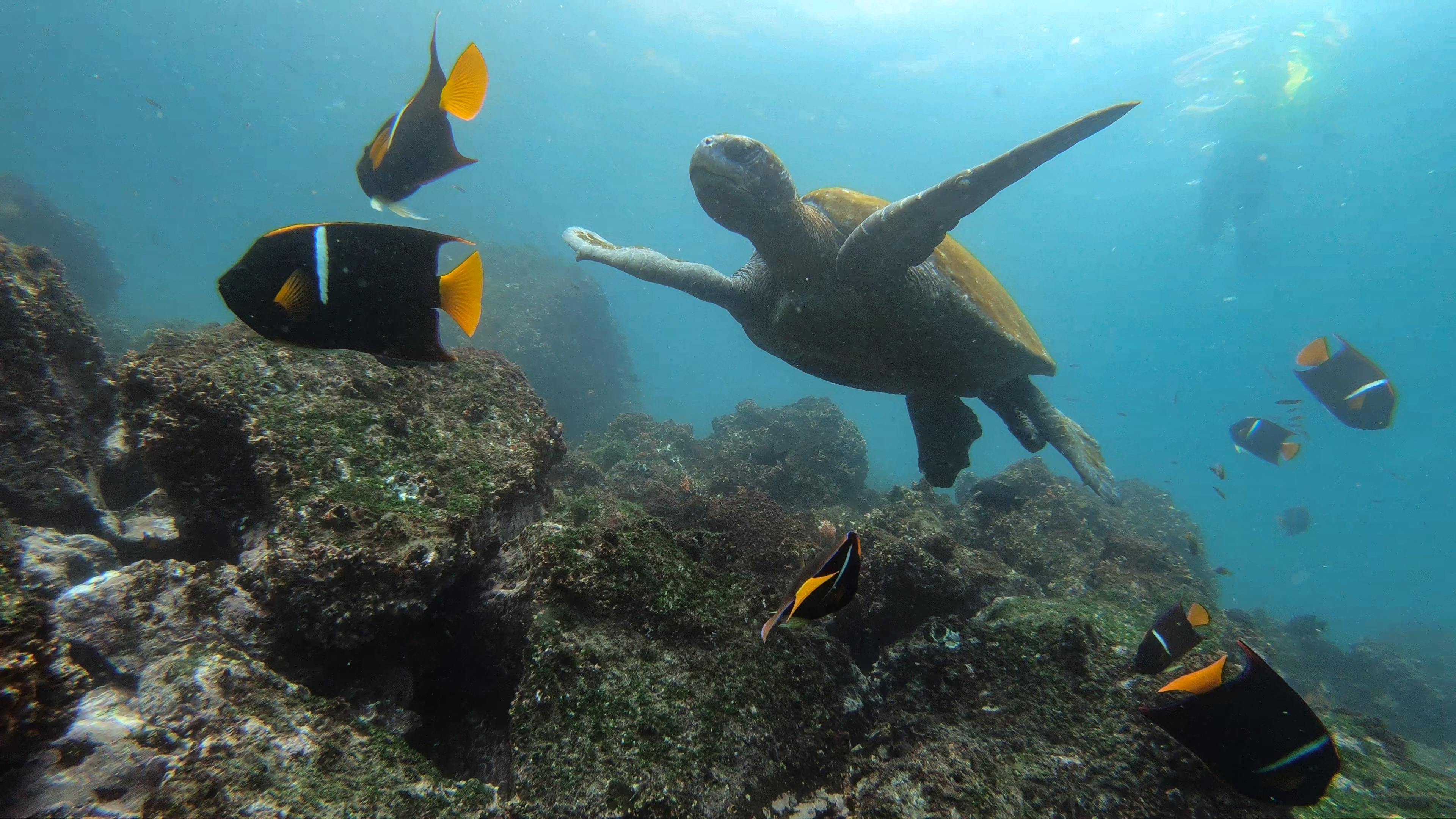 Then we jumped into our wetsuits to explore what was hidden beneath the surface. Here we swam among sea turtles and all kinds of colourful fish in large shoals - some of them so compact that you could not see the bottom beneath. The afternoon offered more snorkeling, but along the younger island of Fernandina's lava coast. Here we met the sea iguanas again, busy feeding algae from the underwater cliffs. Galapagos is the only place in the world where you can see iguanas picking up their food in the sea.