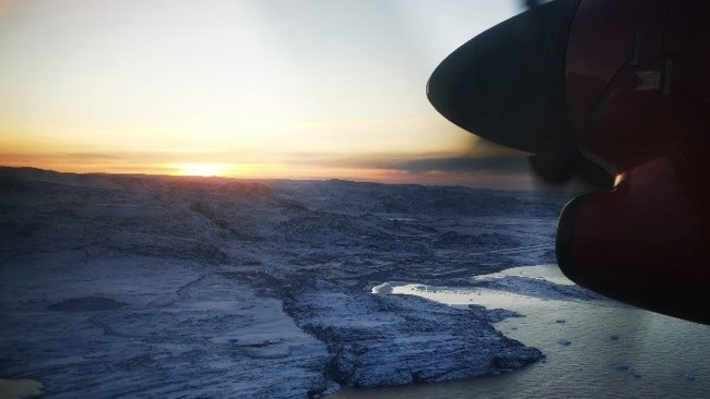 Once inside the small plane, we are welcomed on board with a warm smile from our flight attendant before we take our seats and watch the propeller on the wing start spinning. With a small jolt we are once again up in the air and this time it is impossible to take our eyes off the windowpane. Outside, white expanses, dark blue seas and winding fjord systems rise and as we approach the runway in Ilulissat, the sun has just made its way over the horizon.