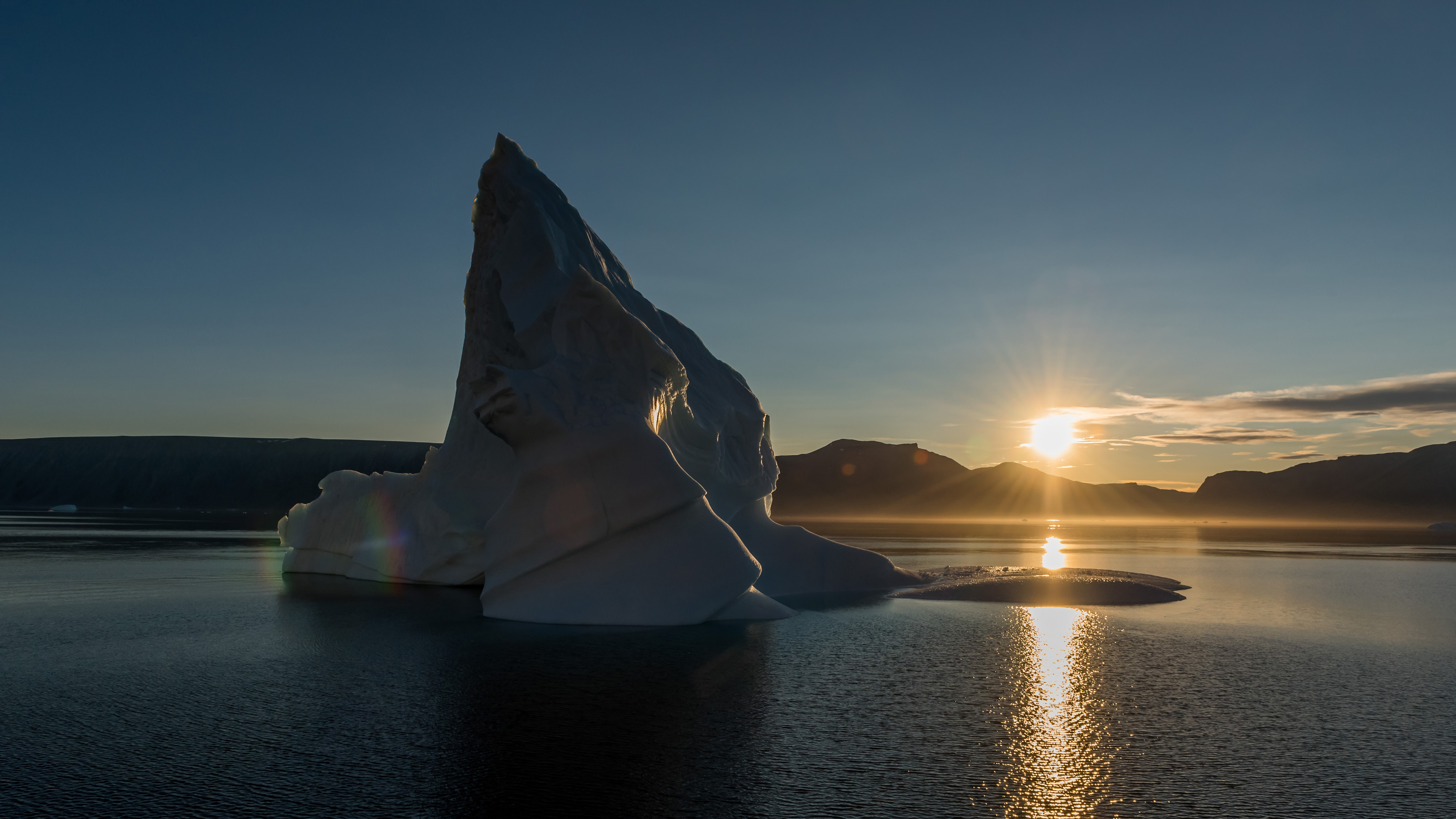We were back on board for a late lunch as the ship repositioned to the coast of Strindberg Land and the huts at Laksehytta. We went ashore on the east side of the river valley as we had spotted musk ox on the tundra. Once ashore we were able to walk closer to these fabulous shaggy beasts as they grazed and then mock sparred with one another, banging their heads together with a resounding thud. We split into groups for walks and photographing the landscape. Those who went to the river’s edge discovered that the Arctic char were running up river to spawn. Glaucous gulls and even two Arctic foxes were trying to feast on them. We could see why one of the huts ashore formerly had been used by fishermen harvesting the char. The other hut is now used by the Sirius Sled Patrol. An abandoned Nansen sledge was outside. The day ended with a wonderful sunset, highlighting a superb coned iceberg and against a backdrop of amazing rock. What a wonderful first day exploring the fjords of East Greenland!