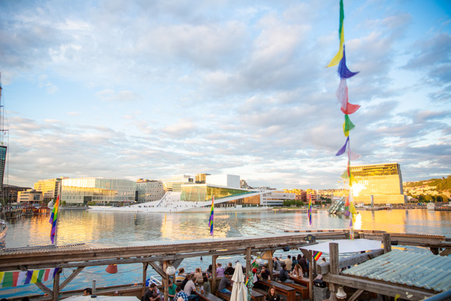 Overlooking Oslo's famous opera house lies this nomadic art project. The pyramid-shaped wooden structures are called hesjer and originate from traditional building methods along the Norwegian coast. Things happen here all year round! There are six saunas, numerous food stalls, indoor and outdoor bars, several stages and daily cultural programs.