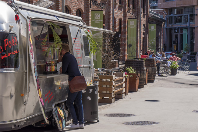 At Mathallen Oslo, in the Grünerløkka neighborhood, you will find exciting products from both Norwegian and international producers. With more than 30 specialist shops, cafes and eateries, there is a wide variety of food and drink on offer. All of high quality. Many of the shops and eateries have their own catering facilities, but you can also buy food from several different places and enjoy it in the middle of the hall, in the square.