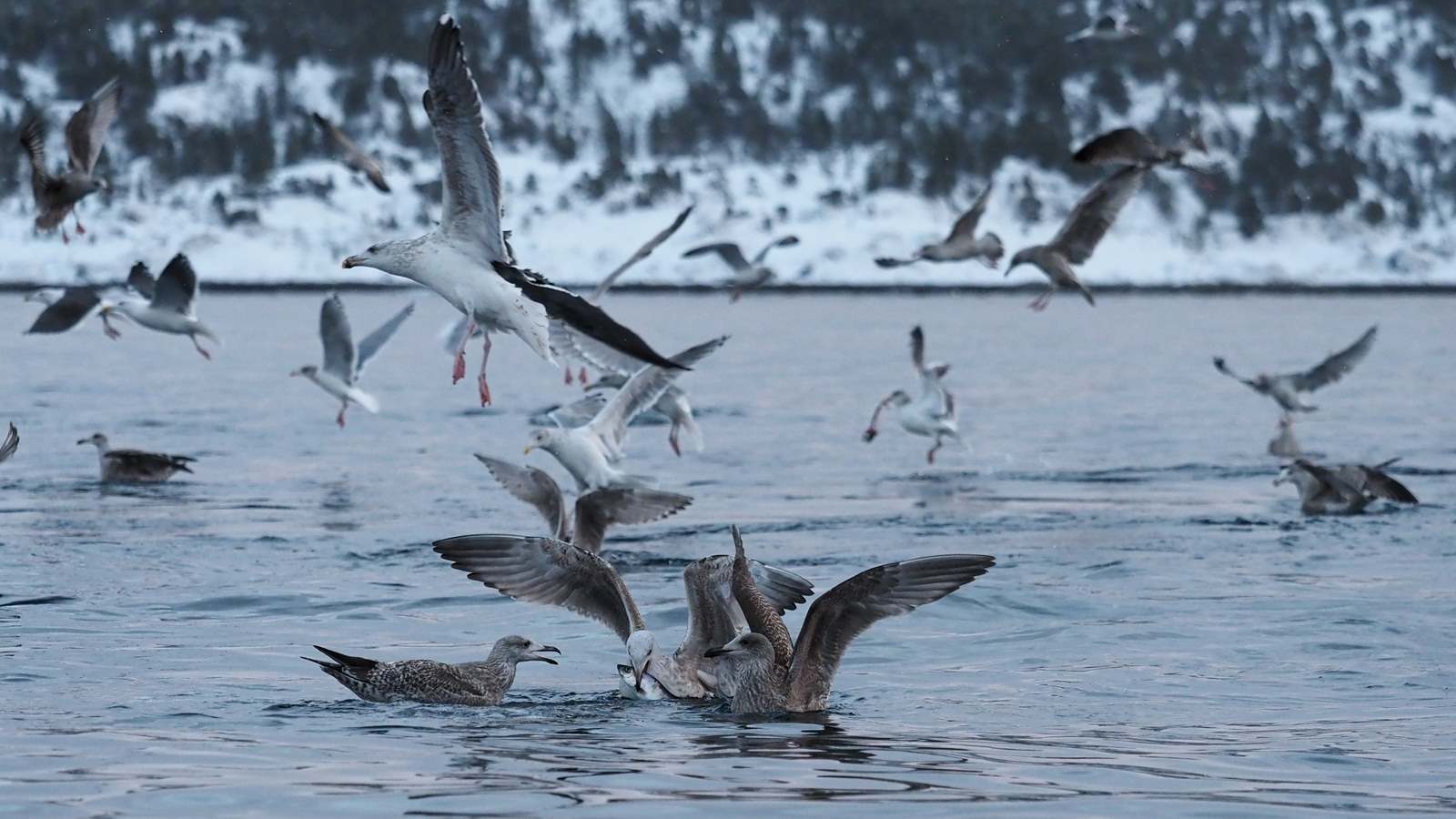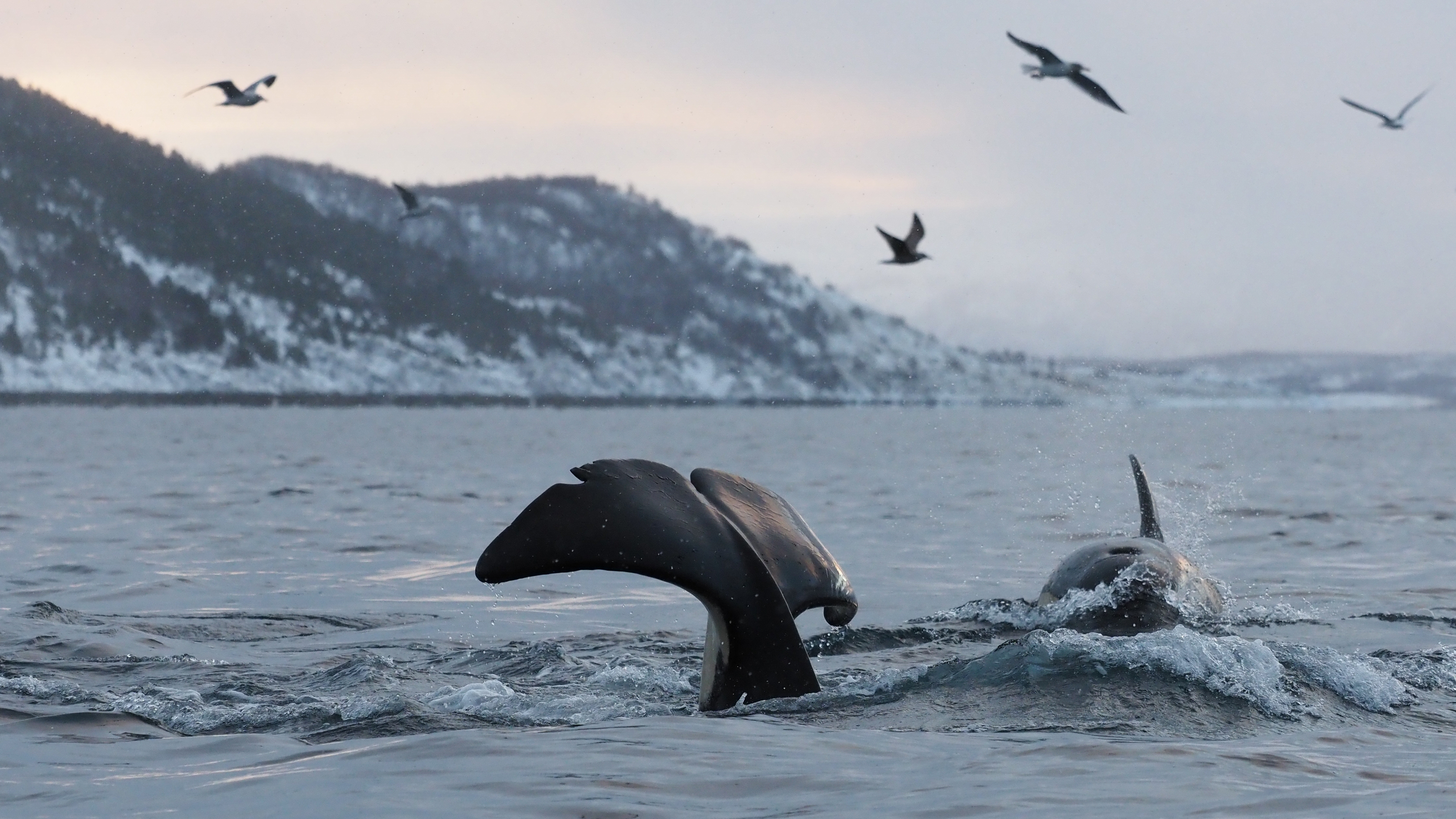 As the two Zodiacs headed out in tandem, a frenzy of gulls was spotted in the distance, above a boiling mess of orca fins.