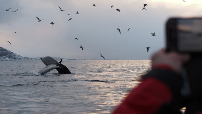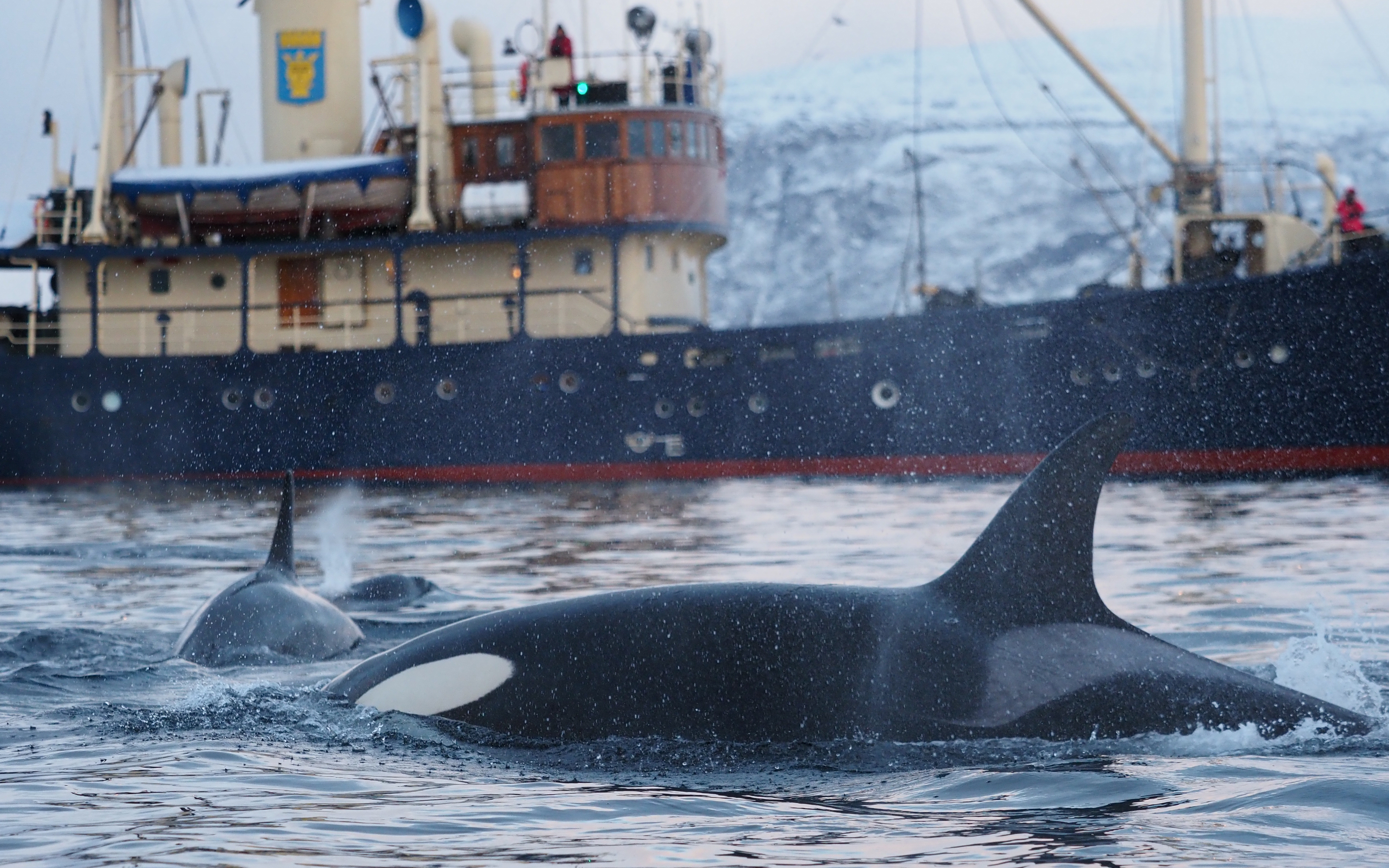 Darkness. Before light, comes the darkness. Such was the morning as M/S Stockholm slowly cruised through the very back of Kvænangen fjord. Dark, brooding clouds covered the sky. Snow fell in large flakes, obscuring the sight of a lone scout guide on top of the bridge. Scouting for orcas.