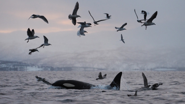As quickly as it had started, the frenzy ended.The Orcas swam off, scouting for more herring to herd. The only traces left behind were pieces of herring intestine floating at the now calm surface. A grim reminder of the darkness that lurks below.