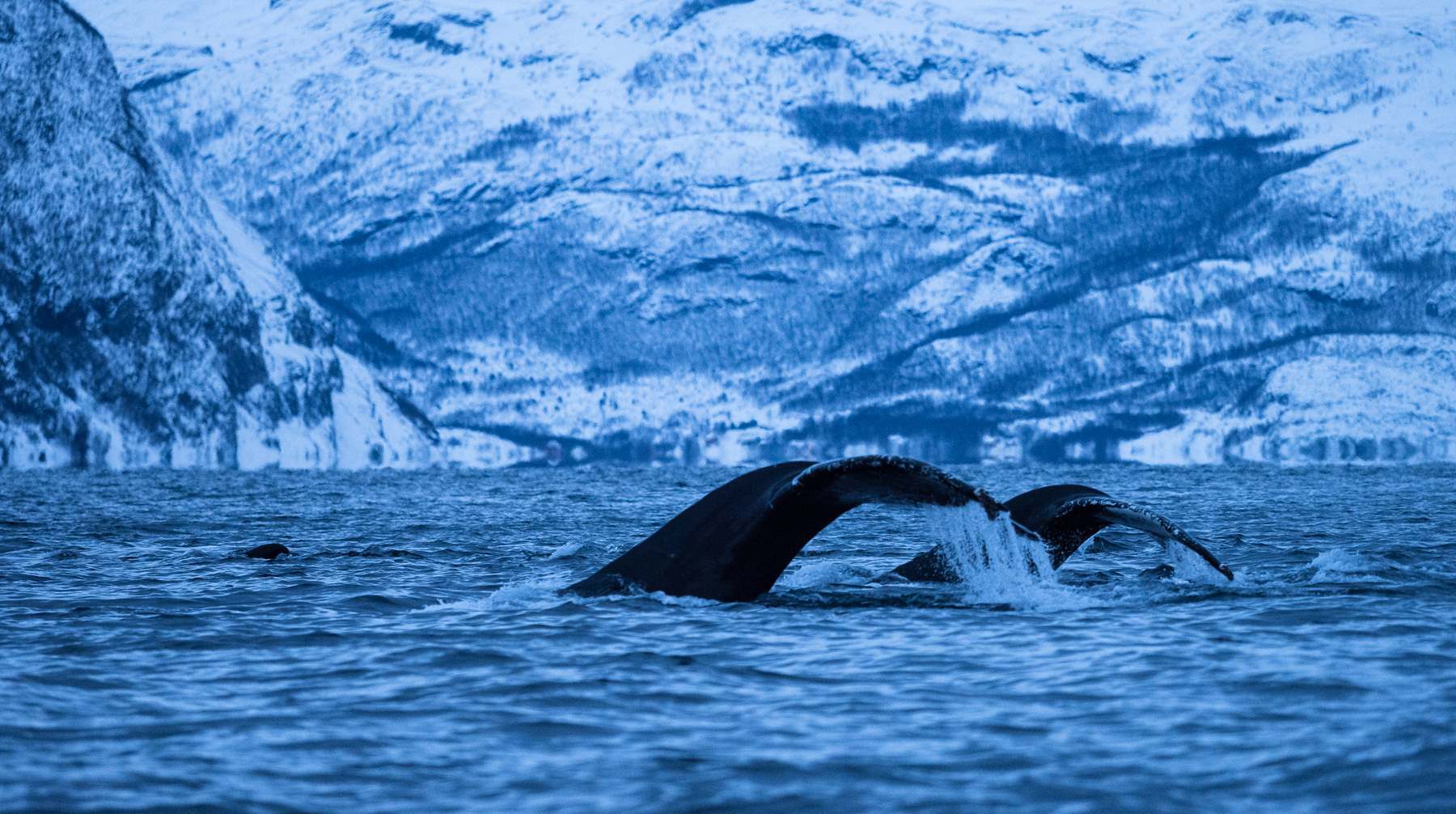 Watching the magnificent northern lights the other night we experienced how cameras are more sensitive to light and therefore “see” more of the weak northern lights than the eye. Here and now it is the other way round. No images will ever be able to capture the feeling in seeing four magnificent tail fins gracefully bend over the water surface before disappearing into the deep. My eyes fill with tears, and it is not only because of the wind