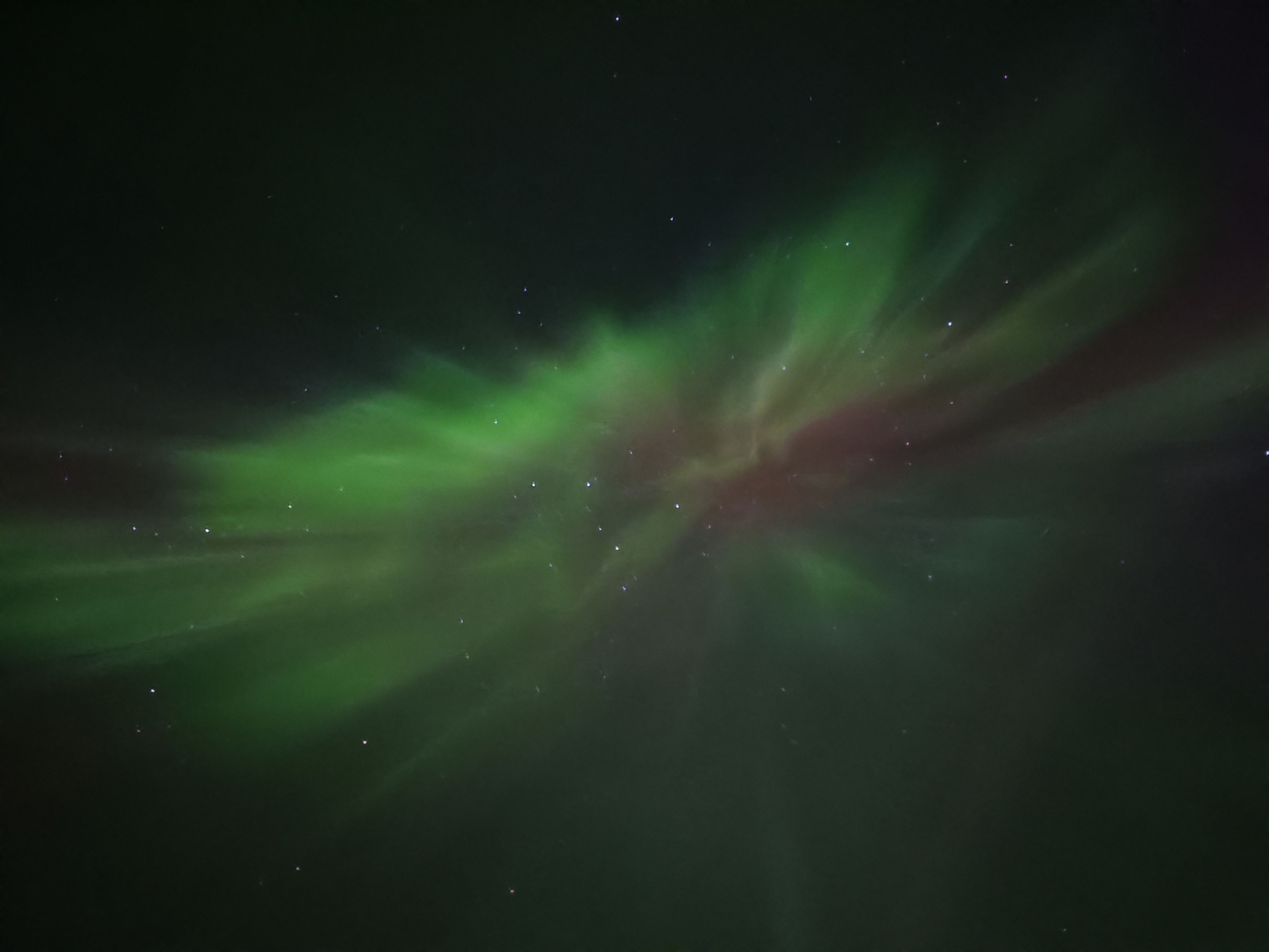 Slowly but surely, lines of green and red laced the clear sky above the ship as we photographed. And then directly above us, the skies burst alight. A corona opened up, a most welcome corona as opposed to some more unwelcome strains of uncertain origin. Greens, reds, and pinks waved down upon us as we stared up at the wonder of nature.