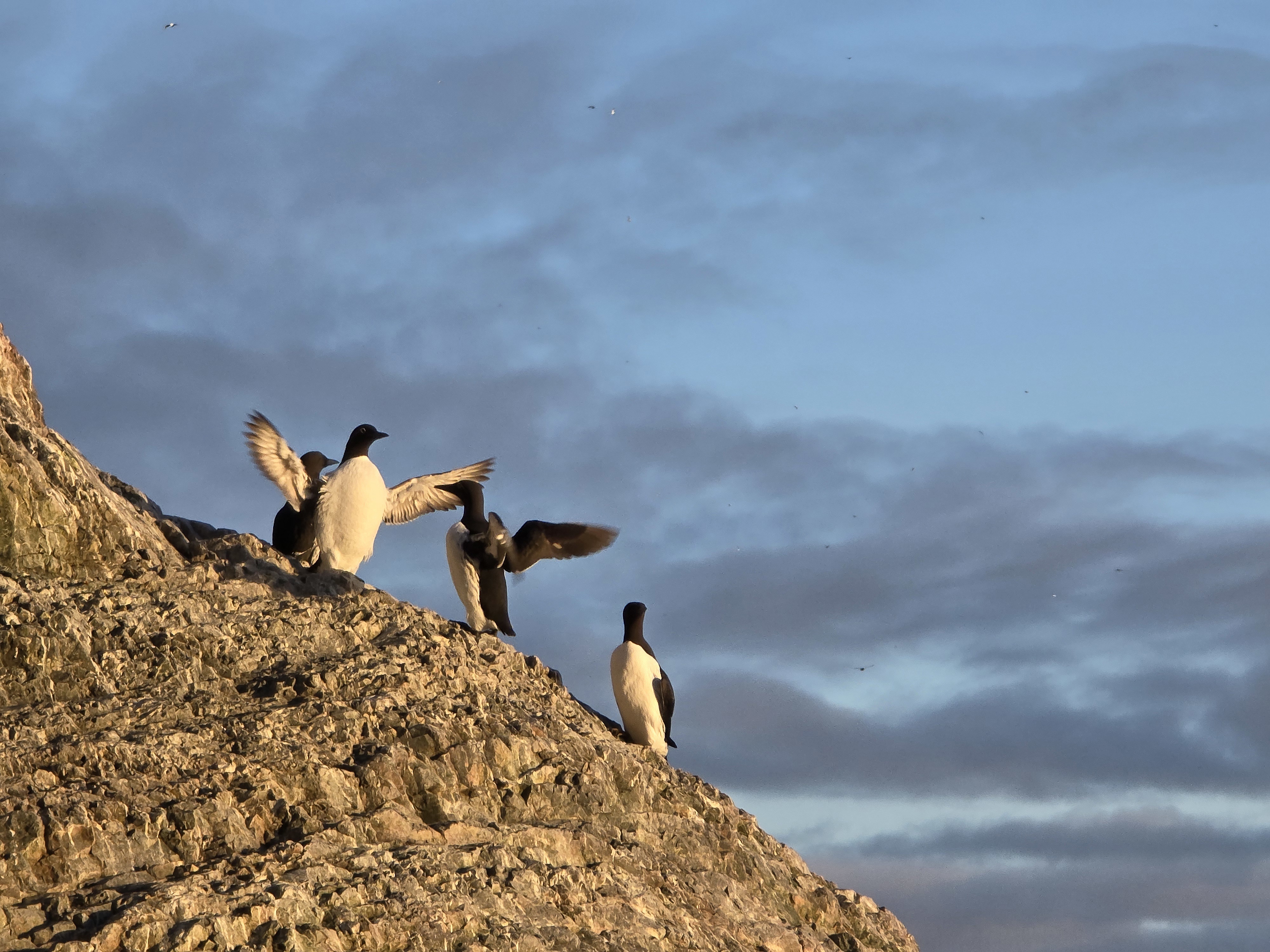 Common species include guillemots, little auks, kittiwakes, and northern fulmars.