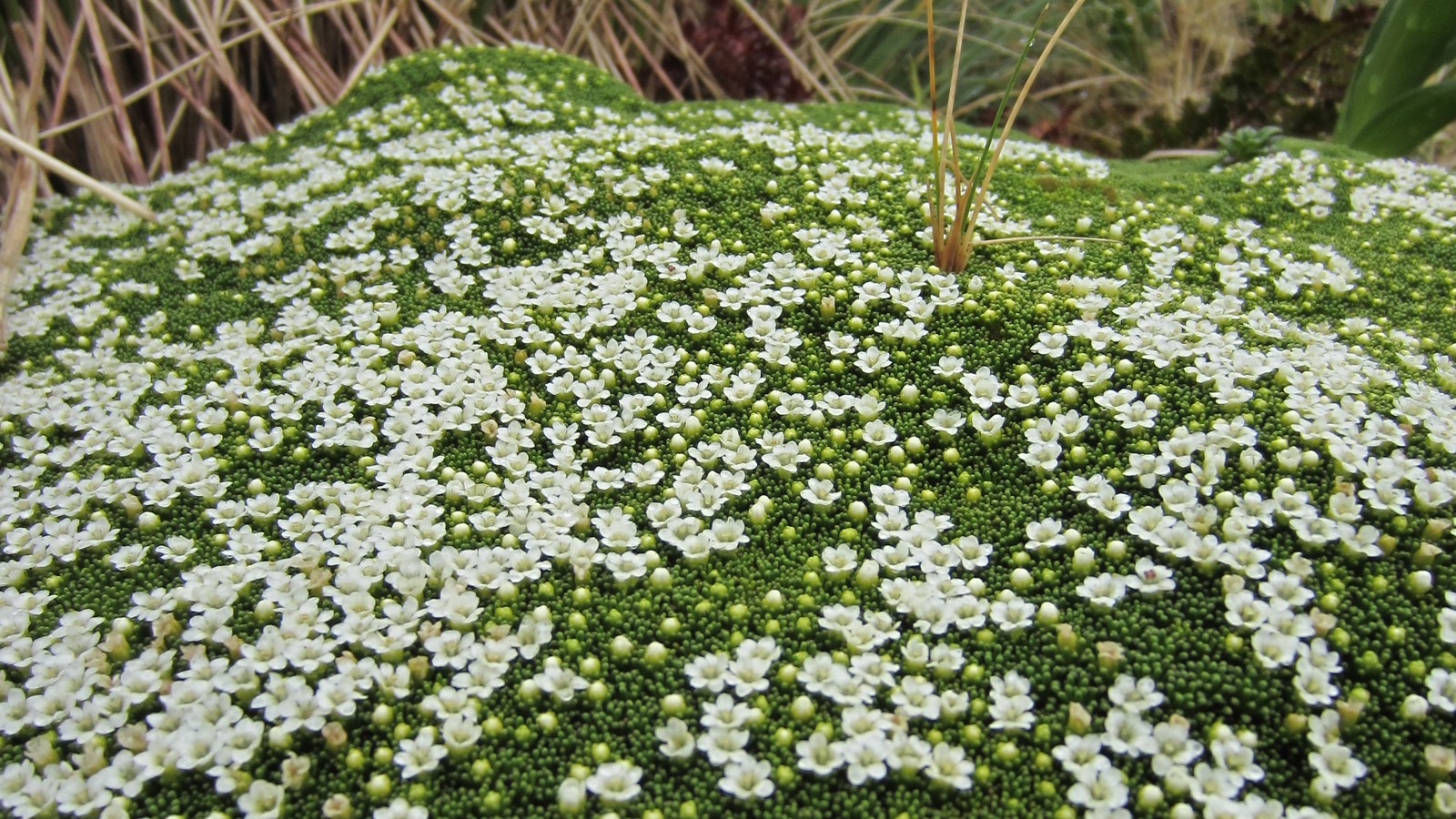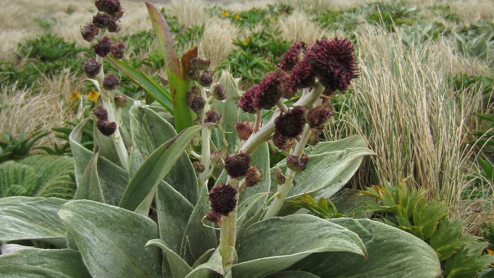 Heavily overcast sky, first tormenting rain, now a light drizzle. Our ship anchored off the former weather station, embraced by the volcanic island’s dramatic yet benign landscape. Here we walked through the dracophyllum forest, up towards the plateau of the inland on a nicely constructed boardwalk. Along the path the yellow corns of the bulbinella and the silver-grey leaves of the plerophyllum, the blue flowers of the hebe bushes, and mosses and lichens. A landscape resembling tundra, ever more dominated by the plumes of the tussock grass.