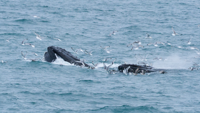 Humpback whales use a special hunting method that involves circling their prey while blowing out air. In this way, they form a so-called 'bubble net'. This means that schools of fish are trapped in a net of bubbles and cannot escape. The whales then swim upwards in the bubble circle with their mouths open, consuming lots of fish at the same time.