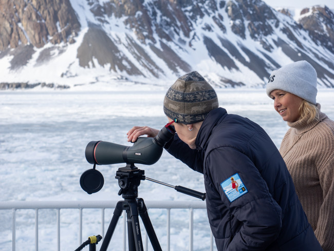 The bear was a challenge to spot—far off on the ice, blending seamlessly with its frozen world, and moving quickly. With binoculars in hand, I helped guests find it, ’follow the large iceberg, or behind the little piece of water “ until the moment of, “Yes I got it !” Watching the amazement spread across their faces as they locked eyes on the Arctic’s most iconic predator.