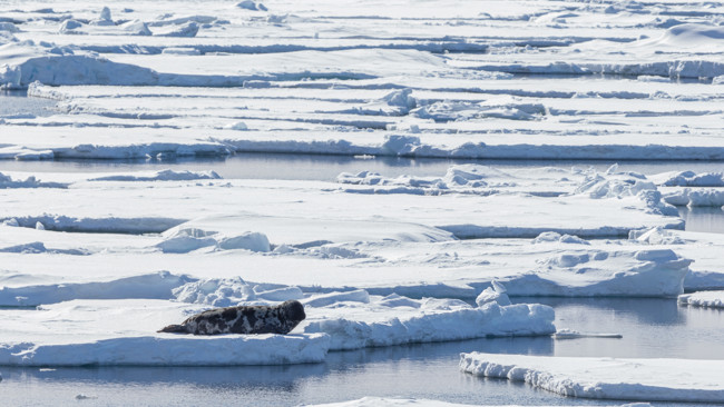 The afternoon brought more magic. Back aboard the ship, we pressed deeper into the pack ice, the ship gliding smoothly through a mosaic of white. I was up on the bridge when I spotted something black – a hooded seals lounging on a nearby ice floe. We gathered everyone on deck quickly. These impressive animals are rarely seen, even by seasoned Arctic travellers. Just as the excitement settled, another one appeared. Two in one day – an incredible stroke of luck.