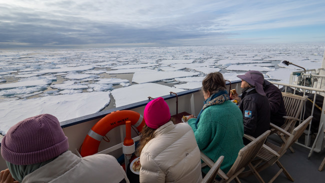 As the sun dipped lower, painting the ice in hues of gold, the crew pulled off something special: a full BBQ on the outer deck. It was chilly, of course, but no one cared. Hot dogs, hamburgers, drinks in gloved hands – and a whole lot of laughter. Some danced, others just took it all in: the endless ice, the glow of the Arctic evening, the mountains of Svalbard silhouetted in the distance.
