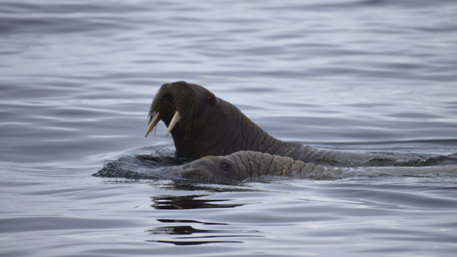 Many visitors dream of seeing walruses when they come to Svalbard. With no real predators thanks to their thick skin and tusks, walruses live on a diet of mussels and oysters. A male walrus can weigh up to 1800 kg and a female 1300 kg. Thanks to its thick skin, the walrus has strong protection against polar bears, although polar bears have started to make attempts to attack walrus. Walruses often lie in large herds on shallow sandy beaches in sex-segregated colonies with females and males alone. Walruses also like to rest on ice floes and occasionally drift away for long distances.