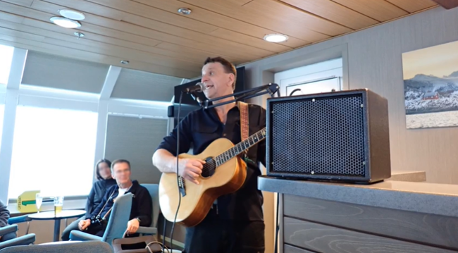 The afternoon back on the boat included three lectures by three of our guides, on life in Svalbard, ecological adaptations and environmental changes in the Arctic and walruses. For dinner, among other things, a fantastic good char was served. In the middle of dinner, we were interrupted by a female polar bear walking along the beach. In peace and quiet, all guests had the opportunity to witness this mighty animal as she strolled along the beach. This set the tone for a perfect evening which ended with a performance by Anders Lundin on guitar.