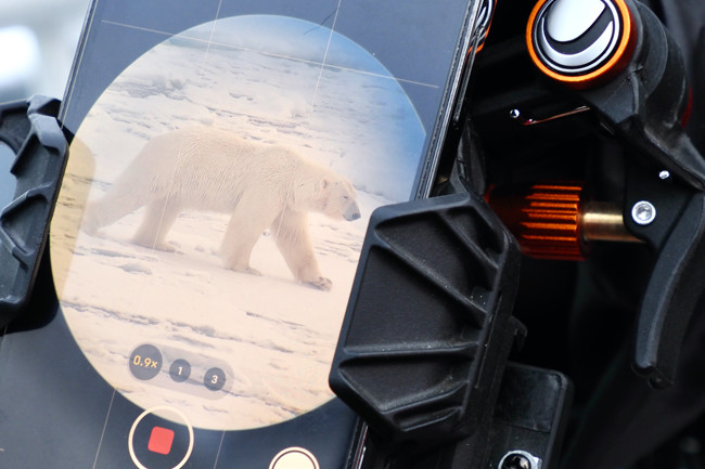 On board the M/S Quest we had a pair of binoculars that were used extensively throughout the voyage. The binoculars had an attachment for digiscoping, which was appreciated by everyone on board. We attached a mobile phone so that we could film through the binoculars and the result was surprisingly good.