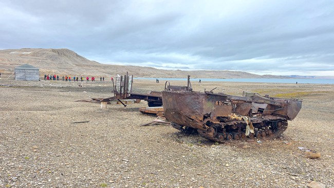 On the way back, we made a small loop and took the time to stop and explore the buildings of Kinnvika. In addition to large barracks with multiple sleeping quarters, we found an observatory for northern lights research and a full workshop with a garage. There was even a sauna (unfortunately closed for viewing)—after all, they are Swedes and Finns! We also came across an old amphibious vehicle, which caught the interest of several men in the group.