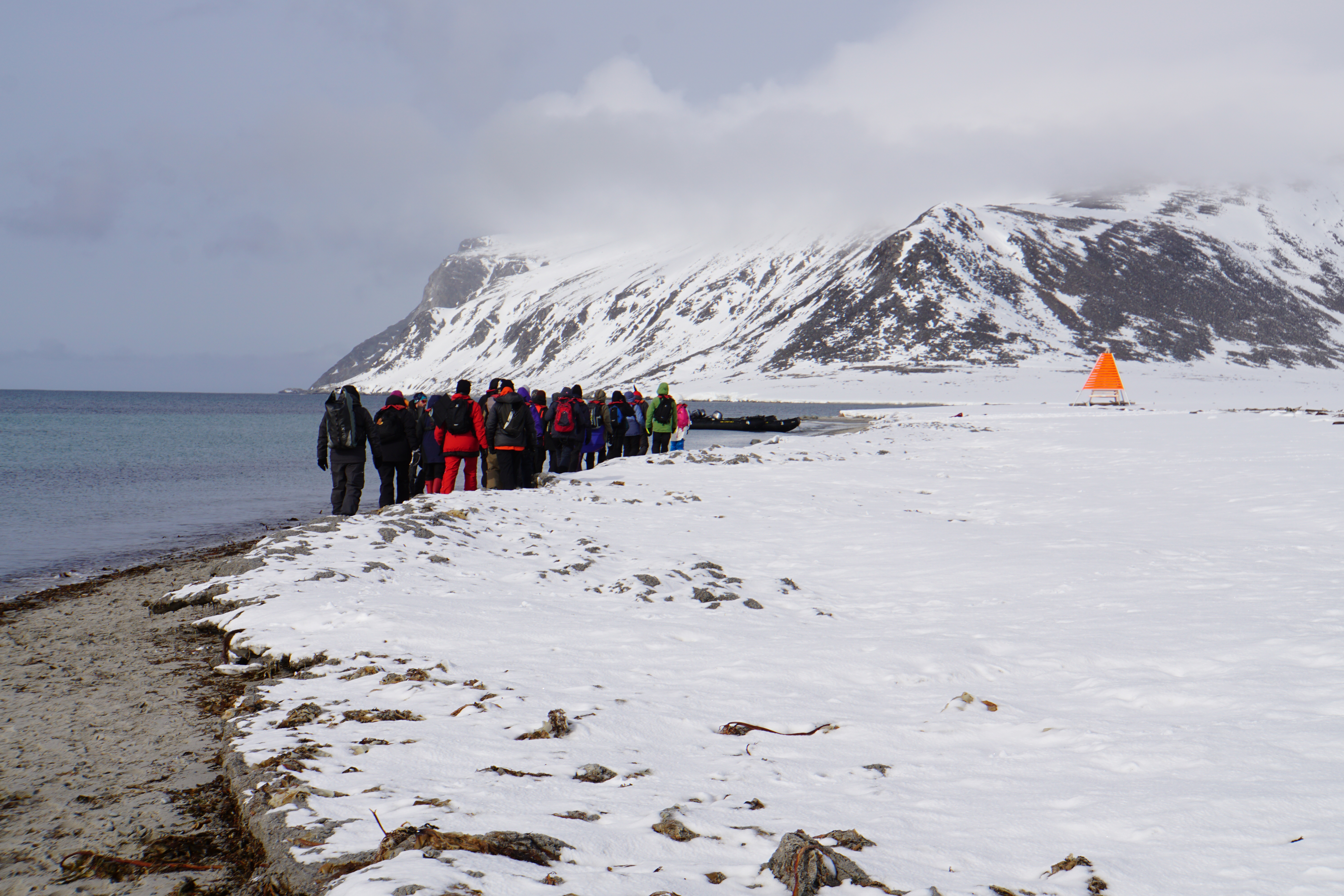 After breakfast we line up at deck two. All participants has signed a list with their names on it, are fully dressed with three to four layers, weather proof jackets, trousers, beanies and gloves, warm rubber boots and life vests on top of it. None of us have had this much clothes on since kindergarden. No one really knows what to expect, but we all know one thing - it's time for some adventure! And it is - a open door on the side of the ship leads us to the gangway where the guides receive us and help us into the Zodiacs.