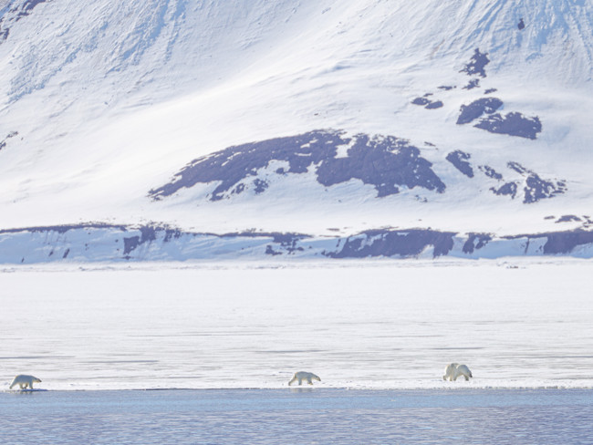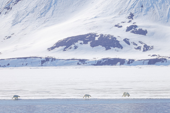 – One glorious morning, flat calm and full sunshine, we all watched a polar bear mother with her 18 month old cubs walking on the sea ice close to the shore. She was looking for seals, the cubs were more interested in playing in the water. They were jumping in and pulling themselves out from a small pool of broken ice. It was such a privilege to watch them doing their own thing in their own time, completely undisturbed by us.