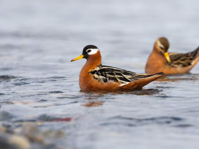 Eventually, we begin our descent back toward the shoreline. From the ridge above, we had already seen movement on the tideline. As we reach the beach, we’re rewarded with a close look at three ‘’grey phalaropes’’, feeding actively near the water’s edge. Nearby, a purple sandpiper hops among the wet stones, seemingly undisturbed by our presence.
