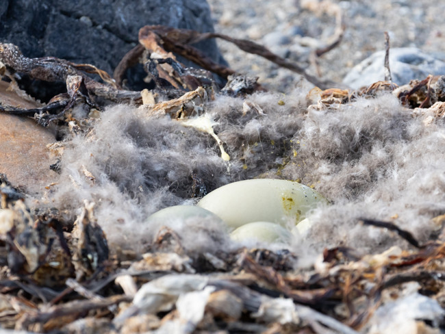 We step ashore with two Zodiacs and begin our hike along the shoreline. Right away, we need to watch our step. Common eiders are nesting on the beach, camouflaged so expertly that they’re nearly invisible. It’s only at the last moment we notice a few of them, sitting tightly on their nests. We carefully wind our way around them, giving them the peace they deserve.