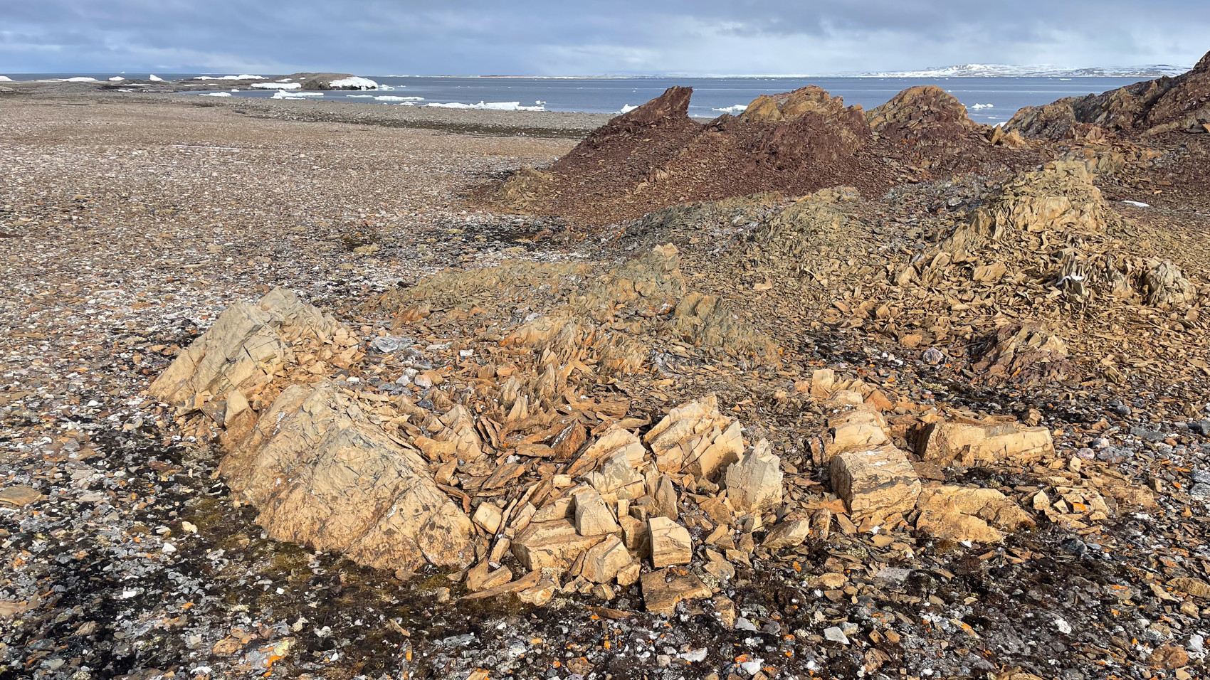 All around us, scattered among the stones, we find stromatolites, fossil-like formations created by microbial mats, some dating back nearly a billion years. The bedrock here is part of the ancient Hecla Hoek formation, rich in geological history. Nearby, the rocks display intriguing octagonal freeze-thaw patterns, shaped over millennia by Svalbard’s intense Arctic freeze-thaw cycles.