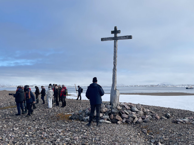 At the top of the ridge, we reach a wooden cross. It’s this cross that gave the island its name “Krossøya,” meaning “cross island.” It’s one of only two intact Russian Orthodox crosses left in Svalbard, originally placed here by Pomor hunters centuries ago. These crosses were spiritual markers and navigation aids, connecting faith to survival in this remote land.