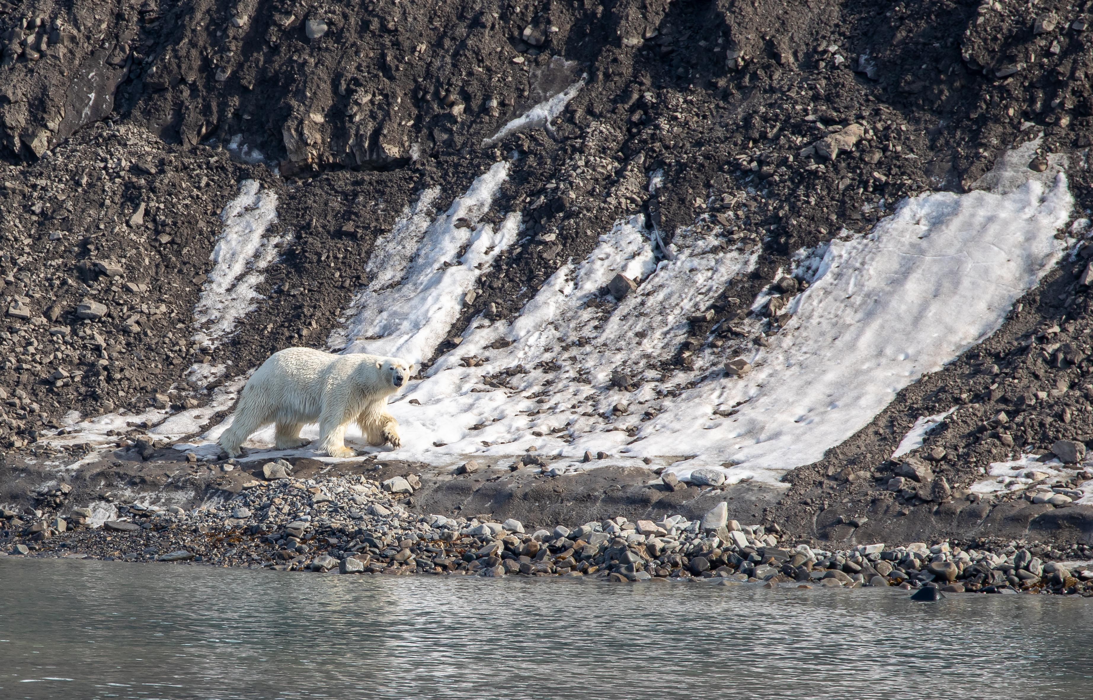 As we were sailing back North towards Woodfjord, Daniel spotted a bear on the coastline. After observing it for a while by ship, we went out in Zodiacs to see it a bit closer. The big heavy male was clearly affected by the heat (8DgC today), and after swimming and walking for a while it laid down for a well-earned nap. The last thing we saw before returning was a big polar bear skull peeking at us over the rocks.