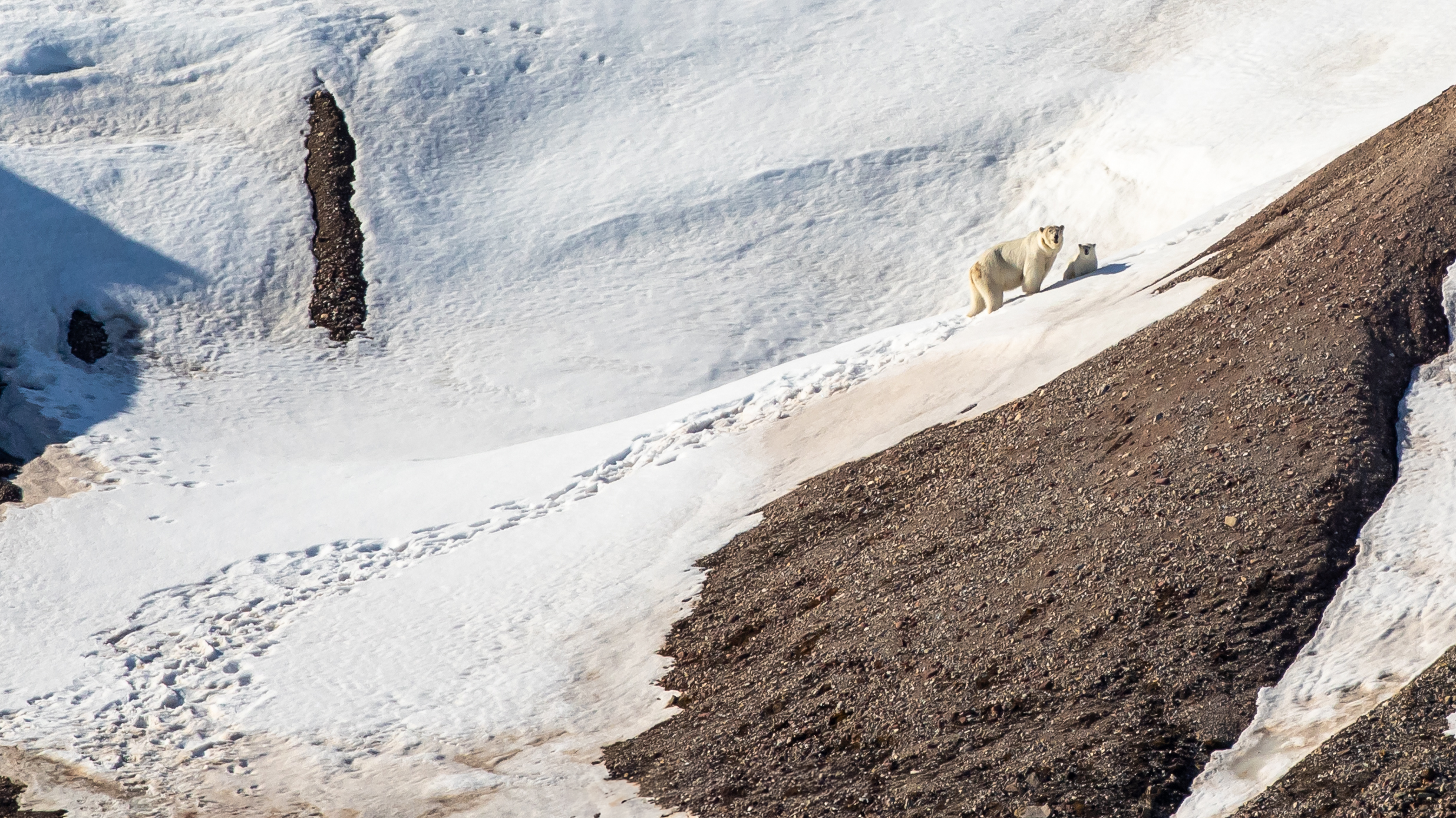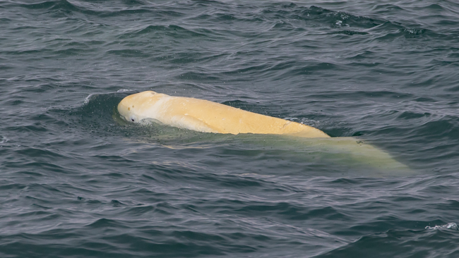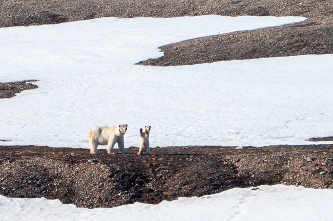 We watched the two polar bears from the ship, where we were around 900m from them, but they were clearly visible through our binoculars. They were feeding on a carcass on the beach, but we saw several times that the cub was be startled by belugas that came close to the shoreline and the bears’ food, and the little cub tried to run up the hillside away from the little white whales. We watched as the mother patiently went up the hill to retrieve her cub and bring it back the food source. It’s not unusual for female polar bears with cubs to be pursued by males that want to kill the cub to be able to mate with the female themselves (statistically speaking, it is unlikely that the cub is his own offspring) so the cub was right to be wary of large white things approaching them from the sea. But this time, it was just beluga passing by and mum knew that it was safe to continue eating.