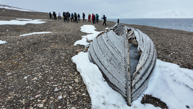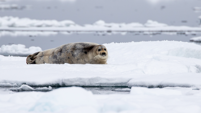 Now in Northeast Svalbard, we prepared for a landing at Nordre Russøya, and as the guides prepared the zodiacs, the sky was heavy with potential weather that we hoped would pass us by. It did not, and after our fill of Pomor trapper history, and had our fill of brent goose & great skua sightings, we were sufficiently drenched on the way back to the ship. In the afternoon, we went hiking Faksevågen – in calm but cloudy conditions. Later we cruised deeper into Lomfjorden where we were lucky to spot even more wildlife out on the fast ice.