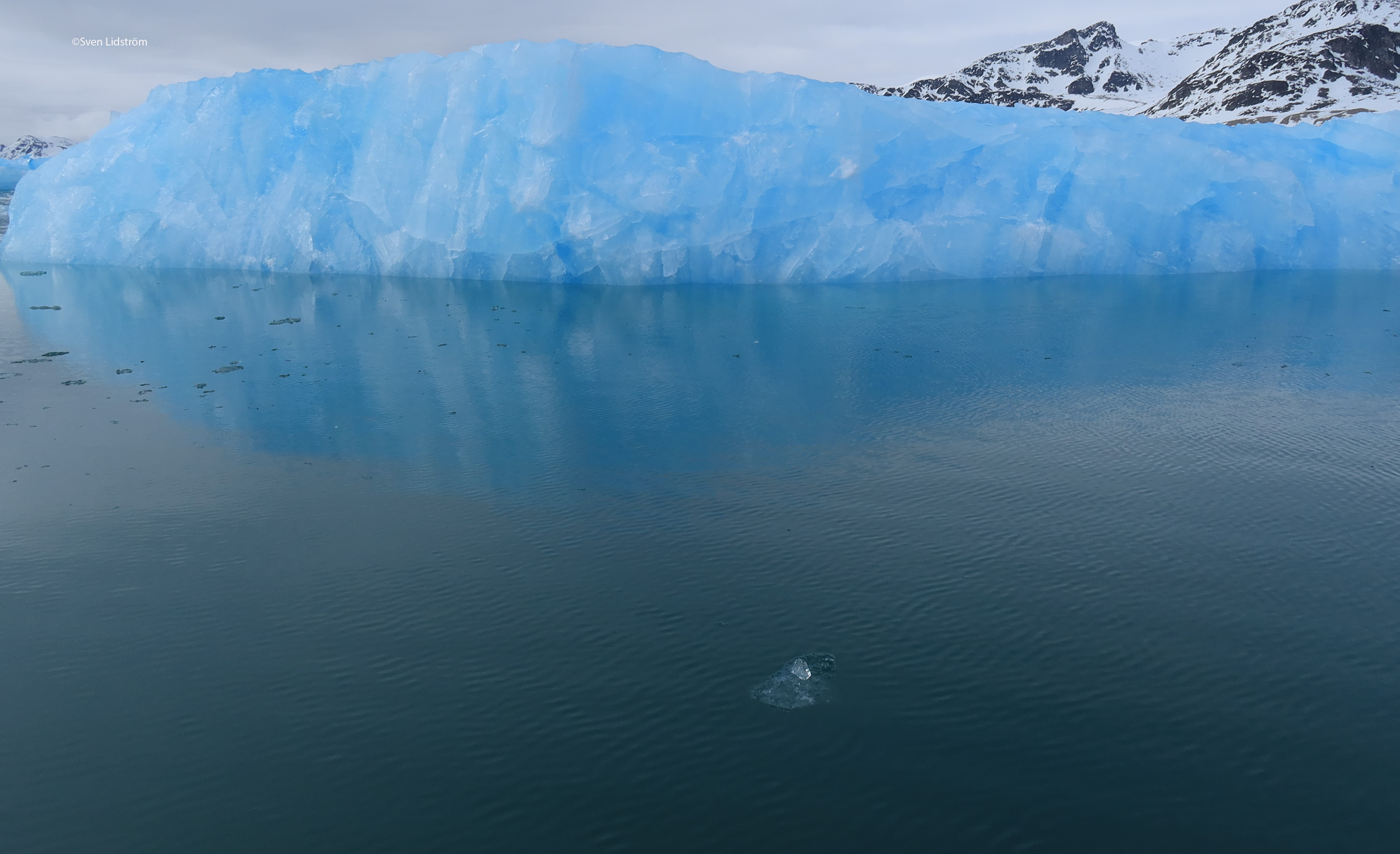 The Smeerenburg glacier calves into Bjørnfjorden, with Göteborgnuten to the south and Uddvallaryggen to the north. That could make many of the Swedish participants to feel at home, if it wasn’t for the blue ice. So why is it blue?