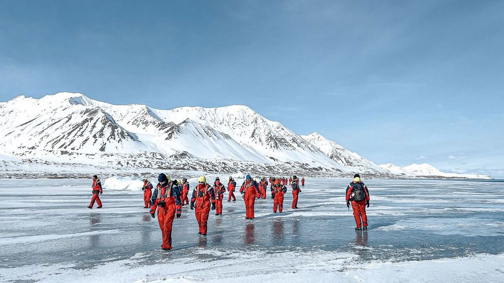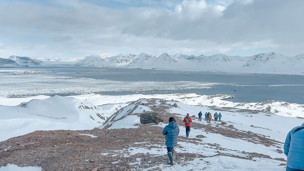 After yoga, we split into three groups and walked at three different speeds. In New London, we climbed to the top of the mountain. Along the way, we spotted some Svalbard reindeer, which are much smaller and cuter than the mainland reindeer. We also observed tracks from a polar fox. Reaching the summit provided us with a spectacular 360-degree view, though the hike up was quite challenging.