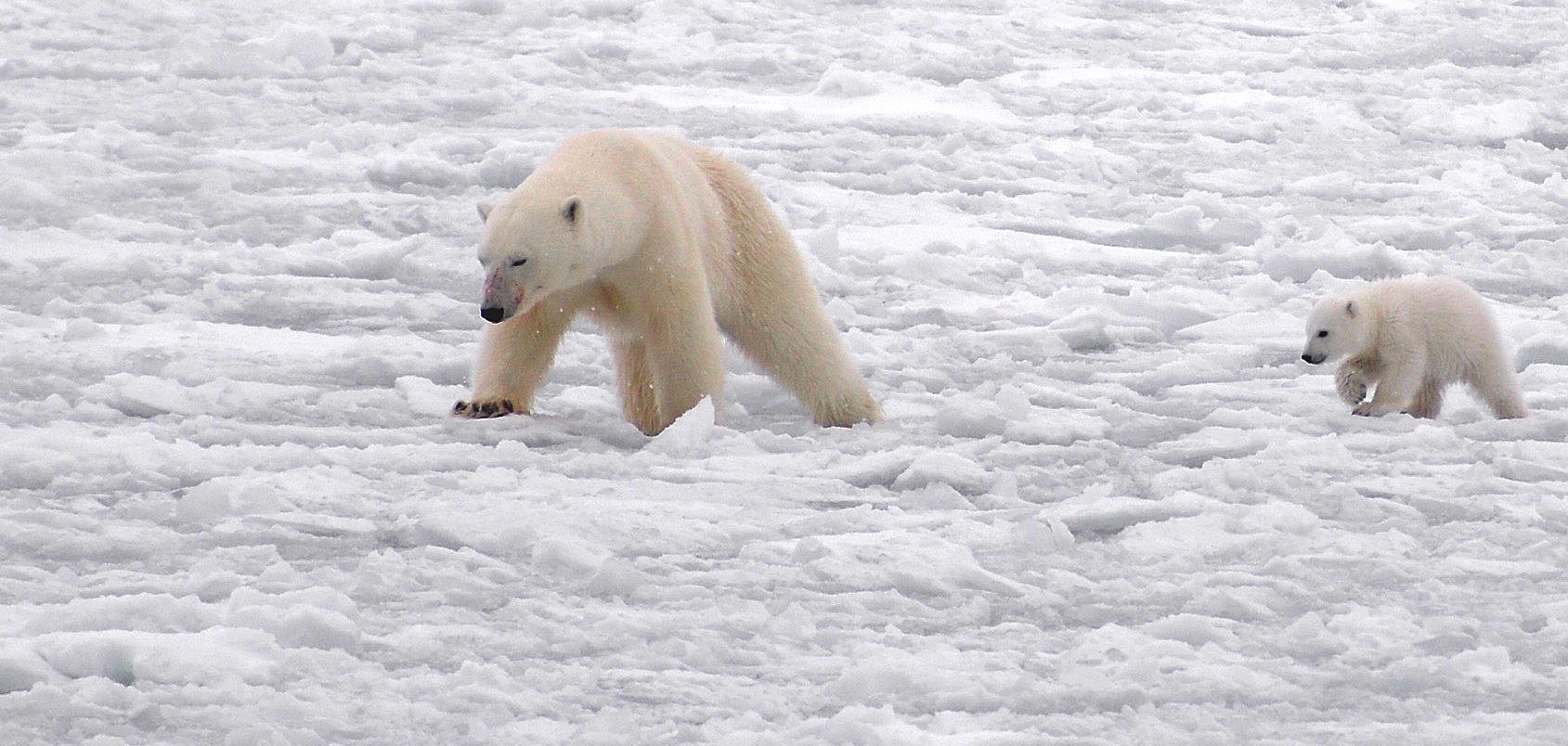 In the evening we approached Raudfjorden, searching for fast ice and hoping for more wildlife. When entering Raudfjorden, Hamiltonbukta impressed us with major breeding colonies of both Brünnich´s guillemots and kittiwakes high up on the vertical cliffs. When continuing into the fjord, Elke, our expedition leader, announced that the bridge had spotted a polar bear! We rushed after our camera gear, warmest jackets and gathered at the deck. The sight of the female polar bear and her young cub made us speechless. What a day!
