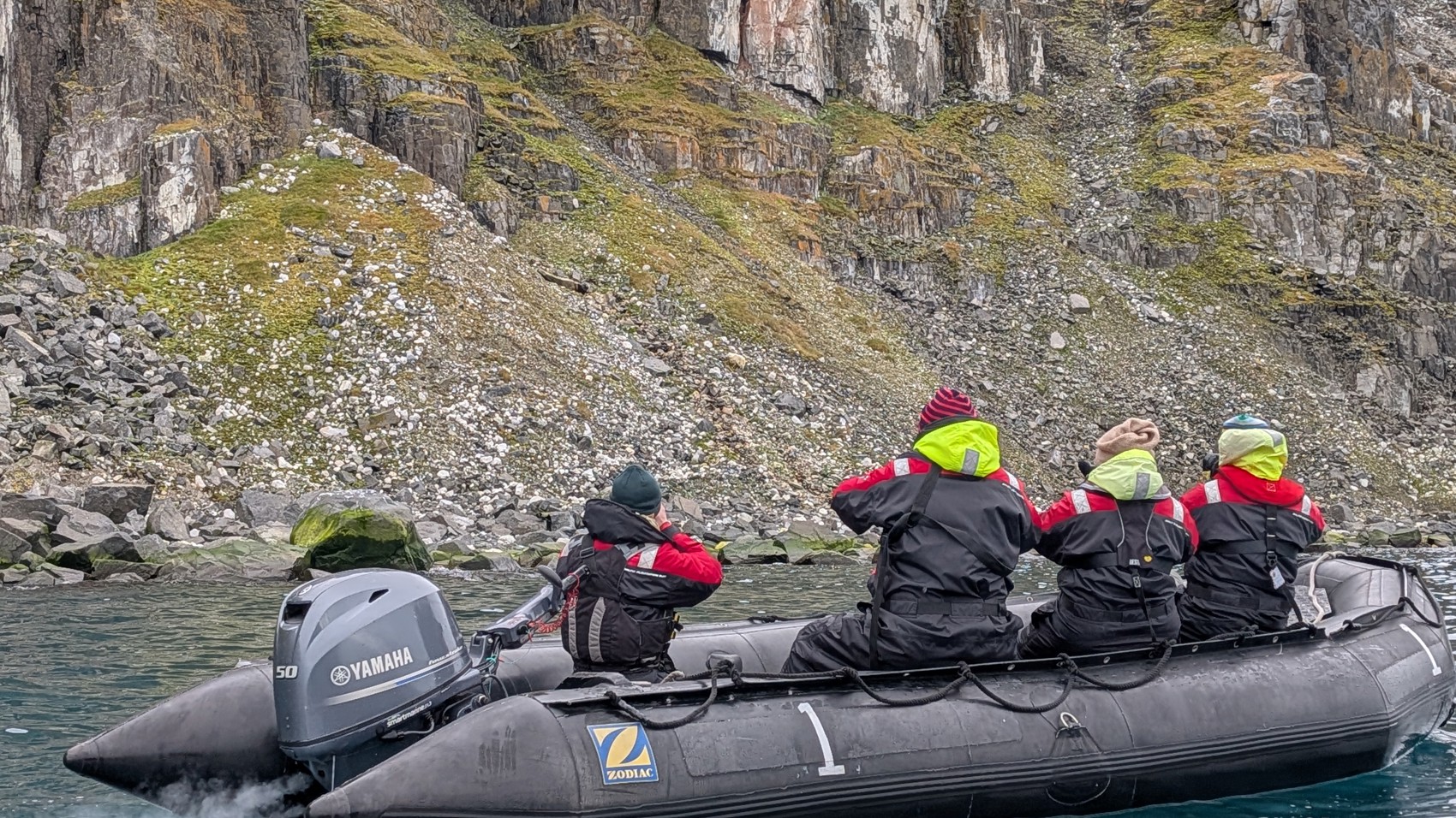 Sitting in our warm flotation suits in the Zodiacs, we take in this unique world. Then Sven, one of the travellers, spots something moving high up on the slope — an Arctic fox! It takes a moment before everyone finds it through their binoculars and manages to follow the quick little creature as it darts across the mountainside.
