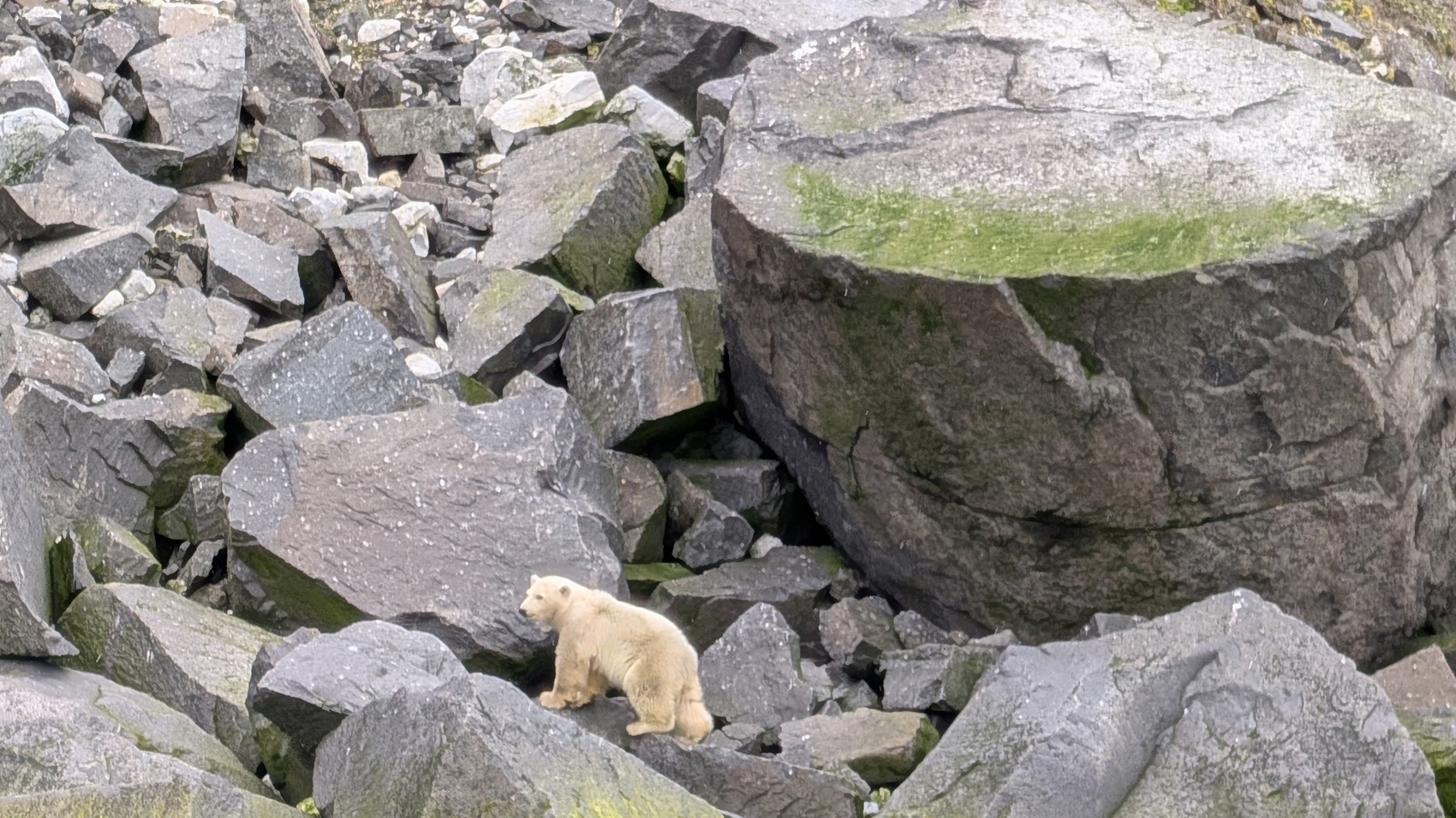 We keep scanning for the Arctic fox when, drifting along the coastline, we suddenly spot a yellowish shape and slow down. Sure enough, it’s a very young polar bear that has found its way to Alkefjellet. The guides tell us this is an extremely rare sighting. We search for the mother, but it soon becomes clear that this young bear is, incredibly, on her own — most likely a female, around two years old, recently separated from her mother.