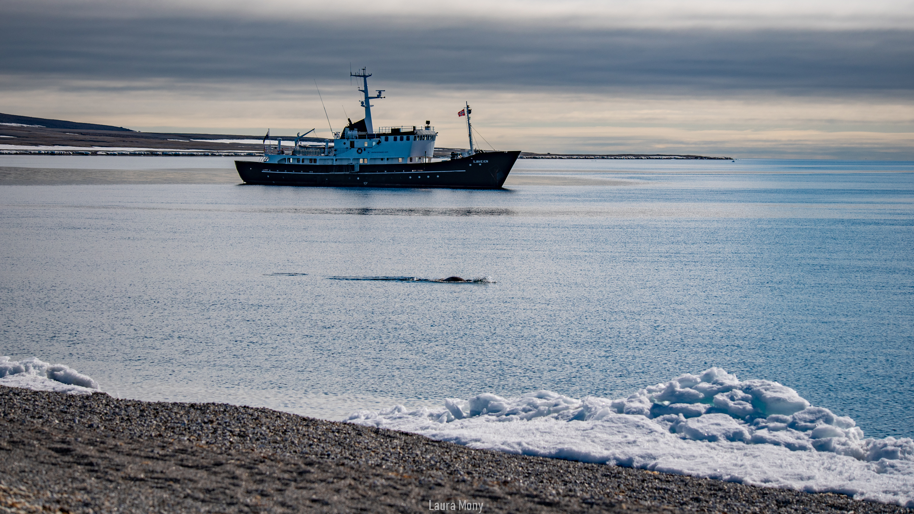 M/S Sjøveien was anchored in front of our landing for the morning, Torellnesset. From the ship, we could see walruses hauling on the beach. Straight form the ship to the zodiacs, to the land, we slowly made our way towards the haul out.