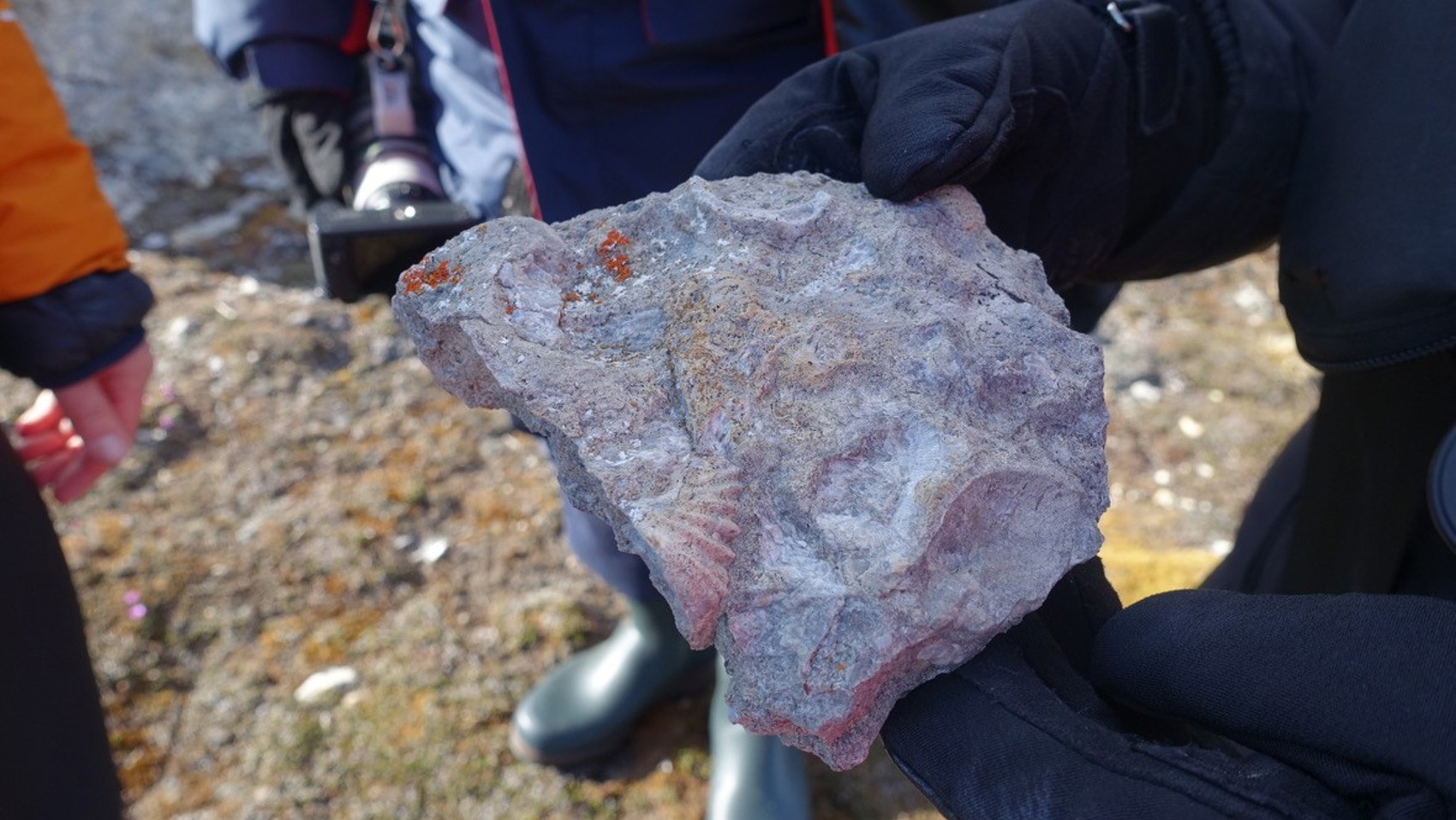 It was windy this afternoon, but with the wind, the clouds also got blown away and we went out in blue sky and sunshine to Bjonahamna. It was our first tundra hike on this voyage and we admired the steep cliffs, where the northern fulmars nested high up. A bit further down, reindeers were grazing on purple saxifrage and we saw a ptarmigan couple flying in. As we proceeded with our walk, our guides told us to keep our eyes peeled for fossils, and look - we discovered more and more petrified shells and fossilized corals, but also eider down, lichens, reindeer hair and even fox fur! It was a lovely stroll and we all chitchated and got to know each other better. As we looked behind us, we noticed, that two reindeer followed us along the beach, constantly in a twenty meter distance. They were obviously very curious. When we stopped they stopped as well, when we walked on, they proceeded with us, it was hilarious!