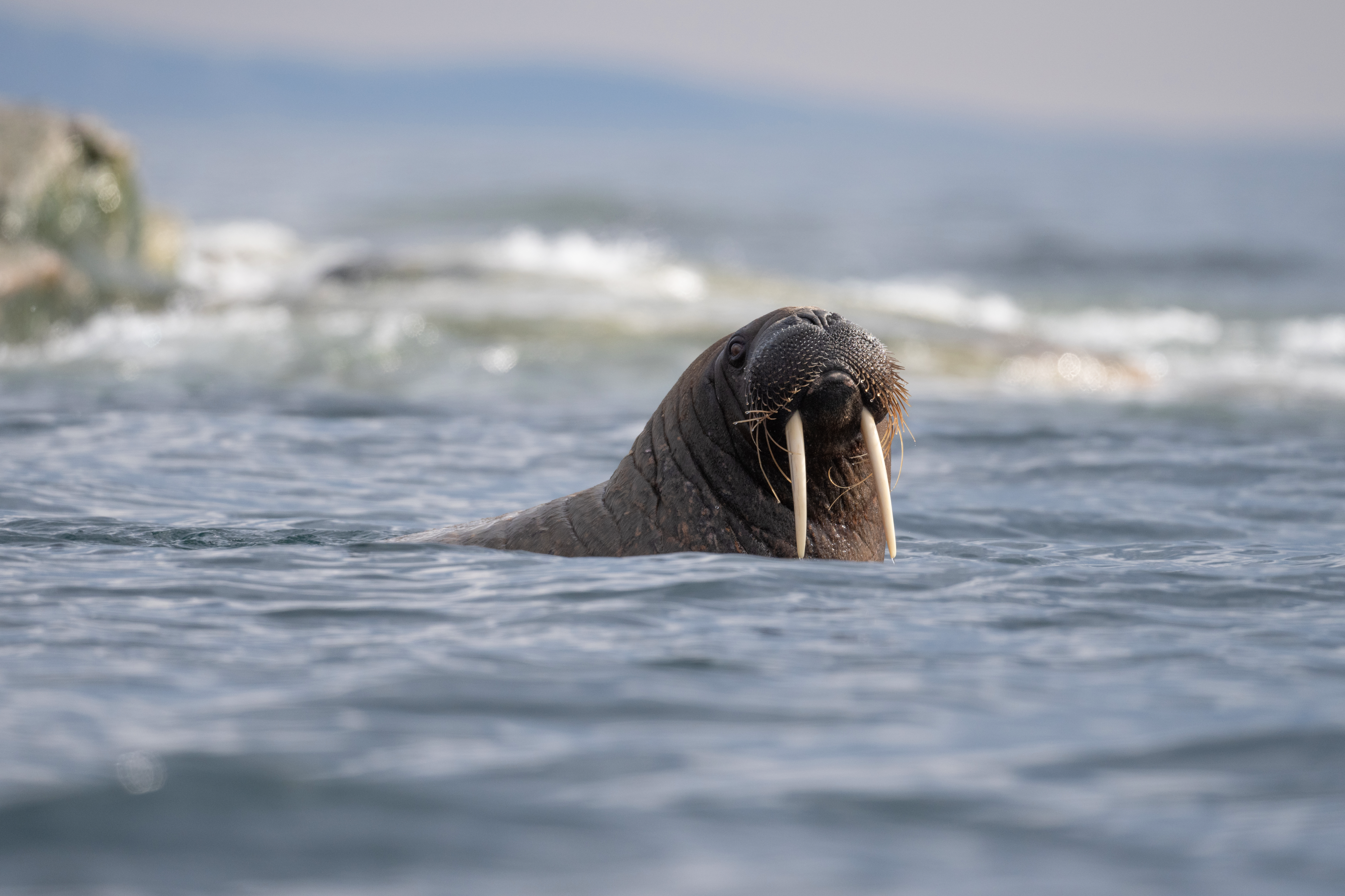 After cruising in the slow swell we arrived at the islands. The animals were of every size and age, seemingly a female group. There were young of varying ages without any tusks. The light was beautiful and made the walrus glow in the sunlight. The mothers were lying at the water ’ s edge with their young and as elegant as only a walrus can be they went in and out of the water.